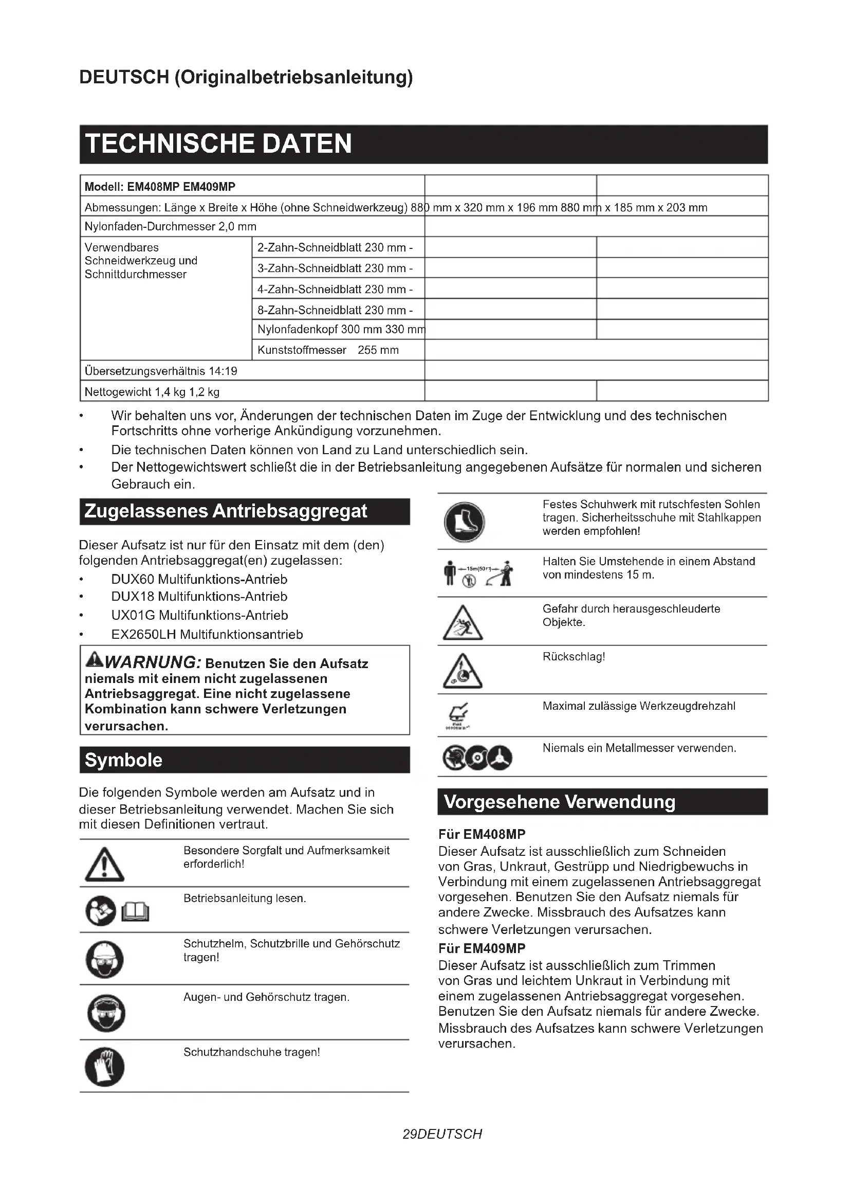 - Der Nettogewichtswert schließt die in der Betriebsanleitung angegebenen Aufsätze für normalen und sicheren Gebrauch ein. Zugelassenes Antriebsaggregat Dieser Aufsatz ist nur für den Einsatz mit dem (den) folgenden Antriebsaggregat(en) zugelassen: