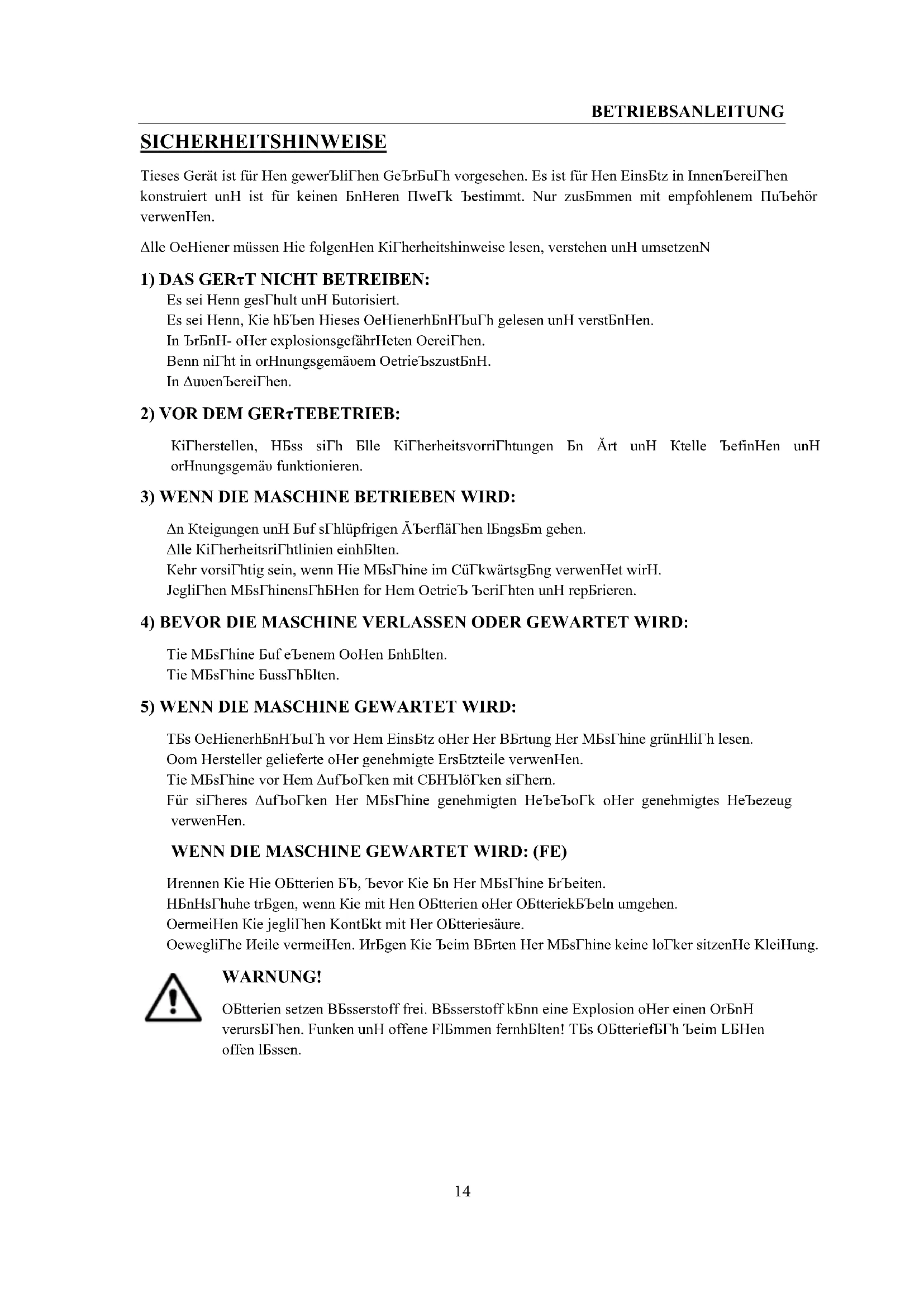 WARNUNG! Brennbare Stoffe können eine Explosion oder einen Brand verursachen. In den Tanks keine brennbaren Stoffe verwenden.