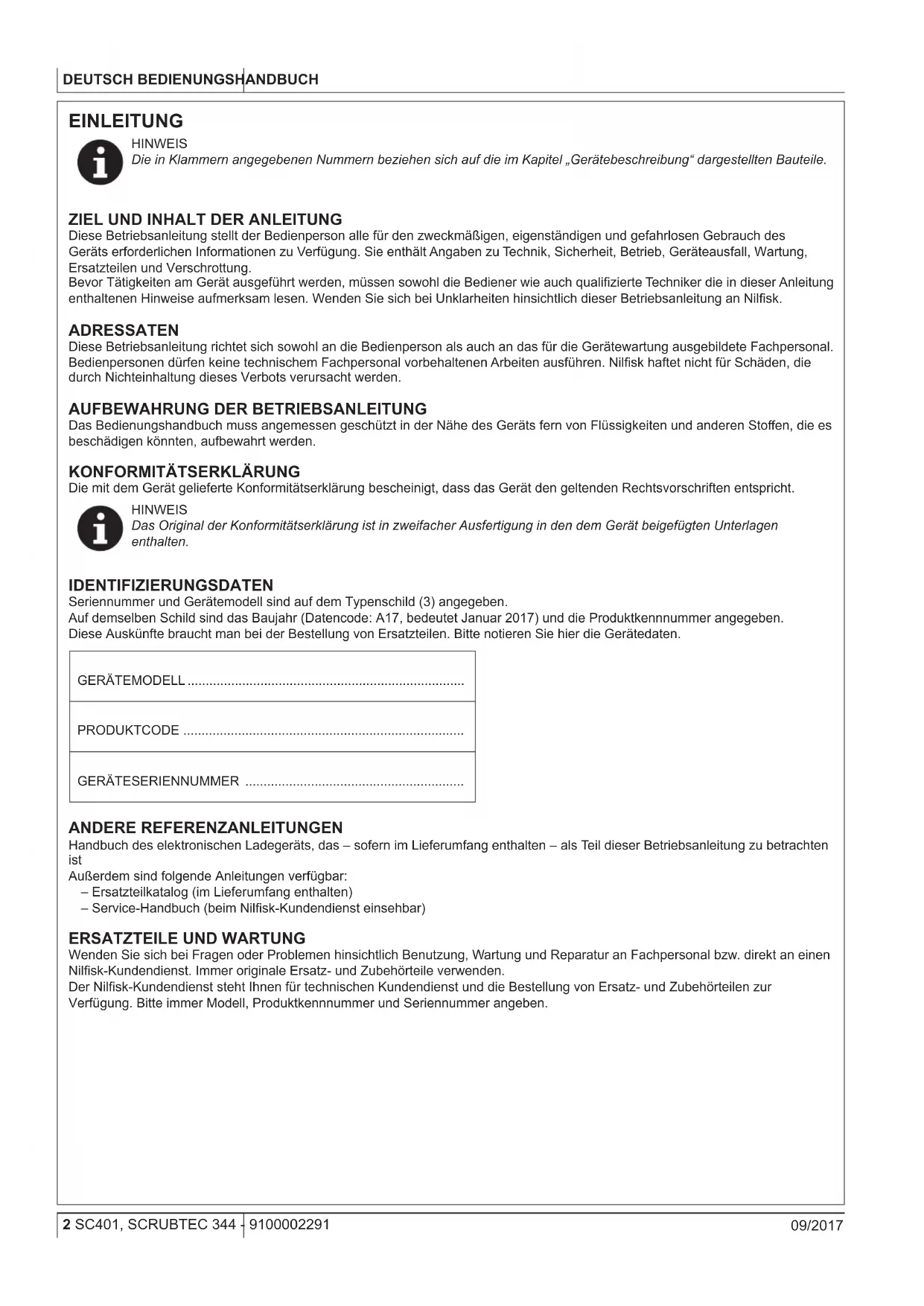 Die mit dem Gerät gelieferte Konformitätserklärung bescheinigt, dass das Gerät den geltenden Rechtsvorschriften entspricht. HINWEIS Das Original der Konformitätserklärung ist in zweifacher Ausfertigung in den dem Gerät beigefügten Unterlagen enthalten. IDENTIFIZIERUNGSDATEN Seriennummer und Gerätemodell sind auf dem Typenschild (3) angegeben. Auf demselben Schild sind das Baujahr (Datencode: A17, bedeutet Januar 2017) und die Produktkennnummer angegeben. Diese Auskünfte braucht man bei der Bestellung von Ersatzteilen. Bitte notieren Sie hier die Gerätedaten. GERÄTEMODELL ............................................................................ PRODUKTCODE ............................................................................. GERÄTESERIENNUMMER ............................................................ ANDERE REFERENZANLEITUNGEN Handbuch des elektronischen Ladegeräts, das – sofern im Lieferumfang enthalten – als Teil dieser Betriebsanleitung zu betrachten ist Außerdem sind folgende Anleitungen verfügbar: – Ersatzteilkatalog (im Lieferumfang enthalten) – Service-Handbuch (beim Nilsk-Kundendienst einsehbar)