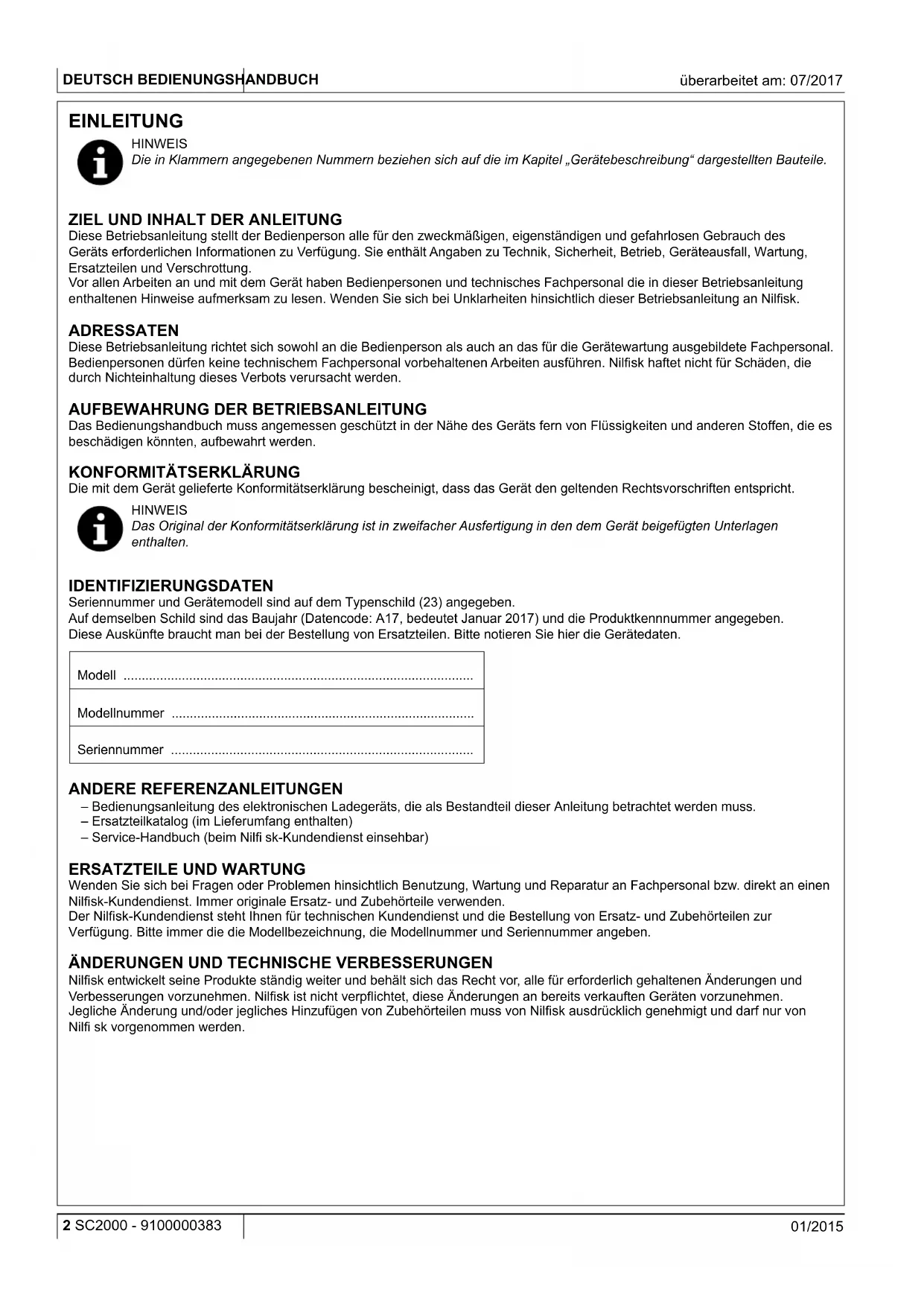 Nilfi sk entwickelt seine Produkte ständig weiter und behält sich das Recht vor, alle für erforderlich gehaltenen Änderungen und Verbesserungen vorzunehmen. Nilfi sk ist nicht verpfl ichtet, diese Änderungen an bereits verkauften Geräten vorzunehmen. Jegliche Änderung und/oder jegliches Hinzufügen von Zubehörteilen muss von Nilfi sk ausdrücklich genehmigt und darf nur von Nilfi sk vorgenommen werden.BEDIENUNGSHANDBUCH DEUTSCH 9100000383 - SC2000 3 01/2015 überarbeitet am: 07/2017 FUNKTIONSEIGENSCHAFTEN Der Schrubbautomat SC2000 wurde für die Reinigung (Wischen und Trocknen) von glatten und festen Fußböden im Gewerbe- und Industriebereich unter kontrollierten Sicherheitsbedingungen und von Fachpersonal entwickelt und gebaut. Die Scheuersaugmaschine ist nicht geeignet für die Reinigung von Tapeten oder Teppichböden. VEREINBARUNGEN Alle in dieser Betriebsanleitung angegebenen Positions- und Richtungsangaben, wie vorwärts und rückwärts, vorn und hinten, rechts und links, beziehen sich auf die Bedienperson in Fahrposition (12). AUSPACKEN/LIEFERUNG Beim Auspacken des Geräts sind die auf der Verpackung angegebenen Anweisungen gewissenhaft zu befolgen. Soll das Gerät manuell fortbewegt werden, siehe Abschnitt „Gerät schieben/abschleppen“. Bei Gerätelieferung sorgfältig prüfen, ob Verpackung und Gerät beim Transport beschädigt wurden. Wenn die Beschädigungen sichtlich sind, die Verpackung behalten, damit sie von der Transportfi rma, die sie abgeliefert hat, vorgeführt werden kann. Für Schadenersatzleistungen unverzüglich mit der Transportfi rma in Verbindung setzen. Überprüfen, ob folgende Teile im Lieferumfang enthalten sind: – Technische Unterlagen: