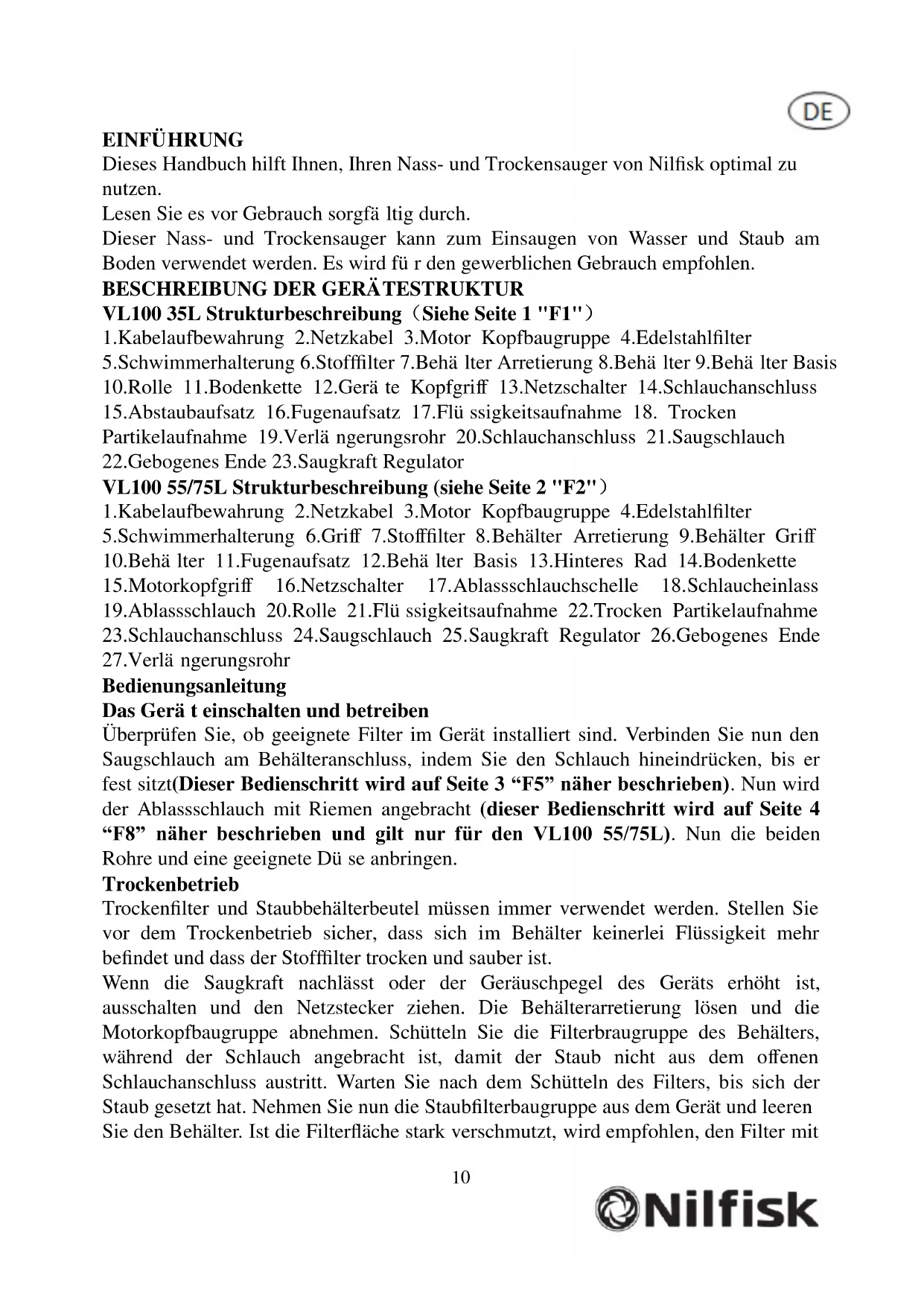 BEDIENUNGSANLEITUNG VL100 NILFISK