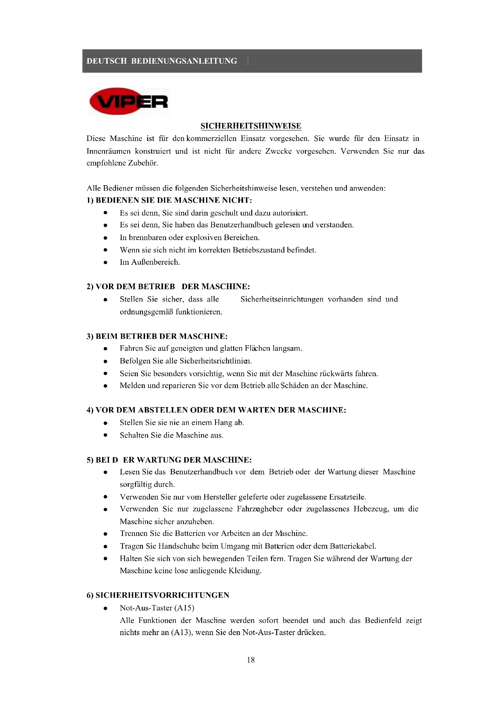 SICHERHEITSHINWEISE Diese Maschine ist für den kommerziellen Einsatz vorgesehen. Sie wurde für den Einsatz in Innenräumen konstruiert und ist nicht für andere Zwecke vorgesehen. Verwenden Sie nur das empfohlene Zubehör. Alle Bediener müssen die folgenden Sicherheitshinweise lesen, verstehen und anwenden: