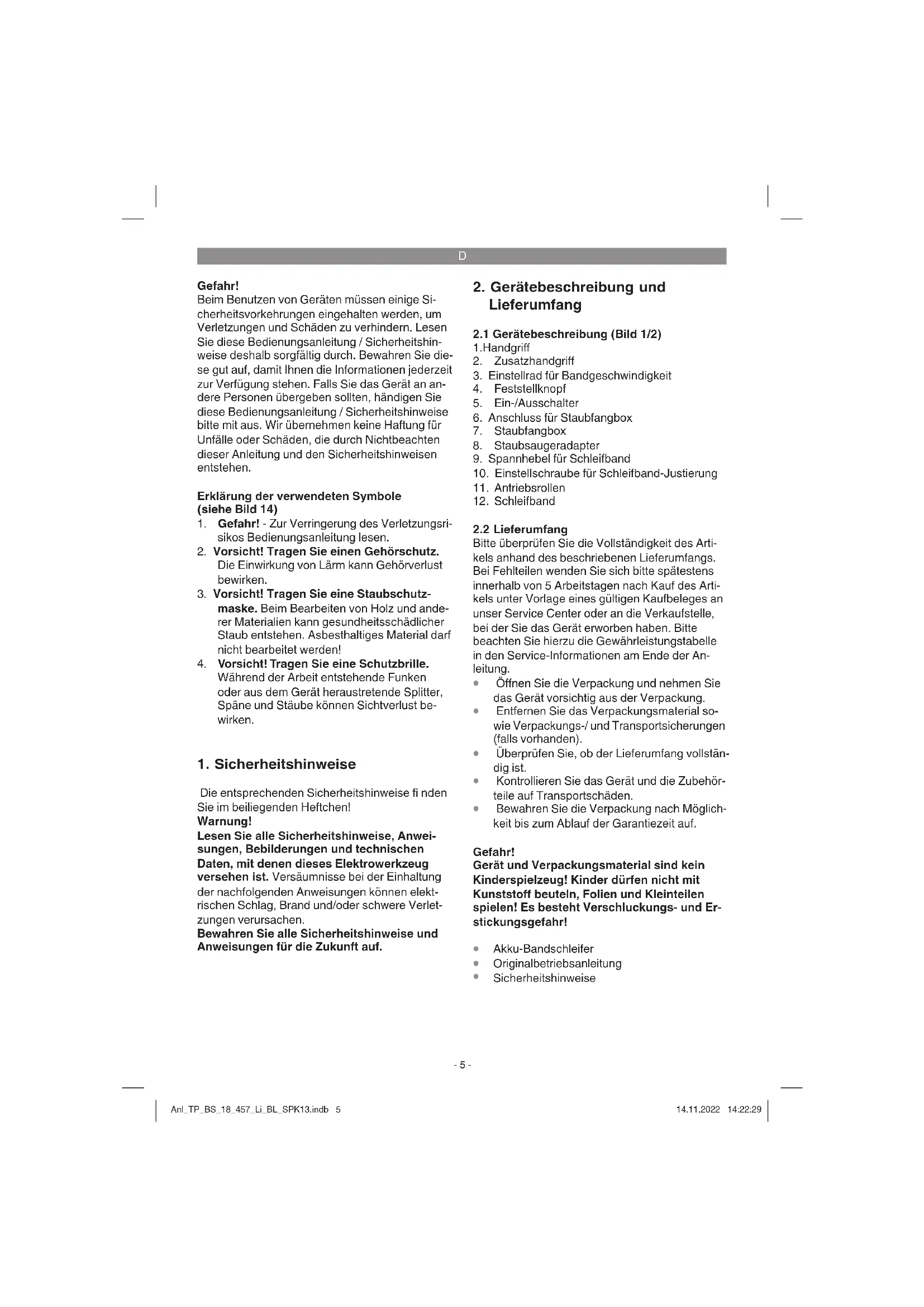 Halten Sie Schutzvorrichtungen, Luftschlitze und Motorengehäuse so staub- und schmutz- frei wie möglich. Reiben Sie das Gerät mit einem sauberen Tuch ab oder blasen Sie es Anl_TP_BS_18_457_Li_BL_SPK13.indb 8Anl_TP_BS_18_457_Li_BL_SPK13.indb 8 14.11.2022 14:22:3114.11.2022 14:22:31D