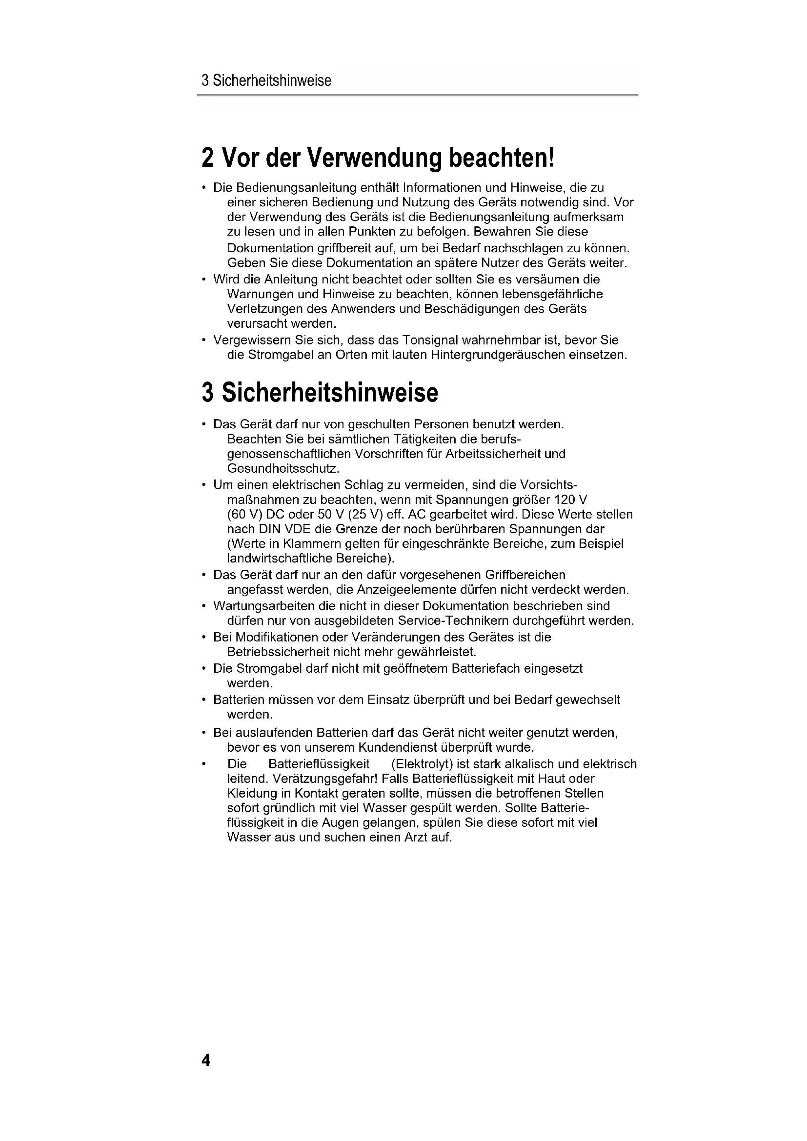 - Bei auslaufenden Batterien darf das Gerät nicht weiter genutzt werden, bevor es von unserem Kundendienst überprüft wurde.