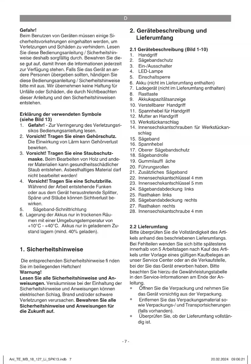 Bevor Sie den Ein-/Ausschalter betätigen, vergewissern Sie sich, ob das Sägeband richtig montiert ist und bewegliche Teile leichtgängig sind. Anl_TE_MB_18_127_Li_SPK13.indb 9Anl_TE_MB_18_127_Li_SPK13.indb 9 20.02.2024 09:06:2220.02.2024 09:06:22D