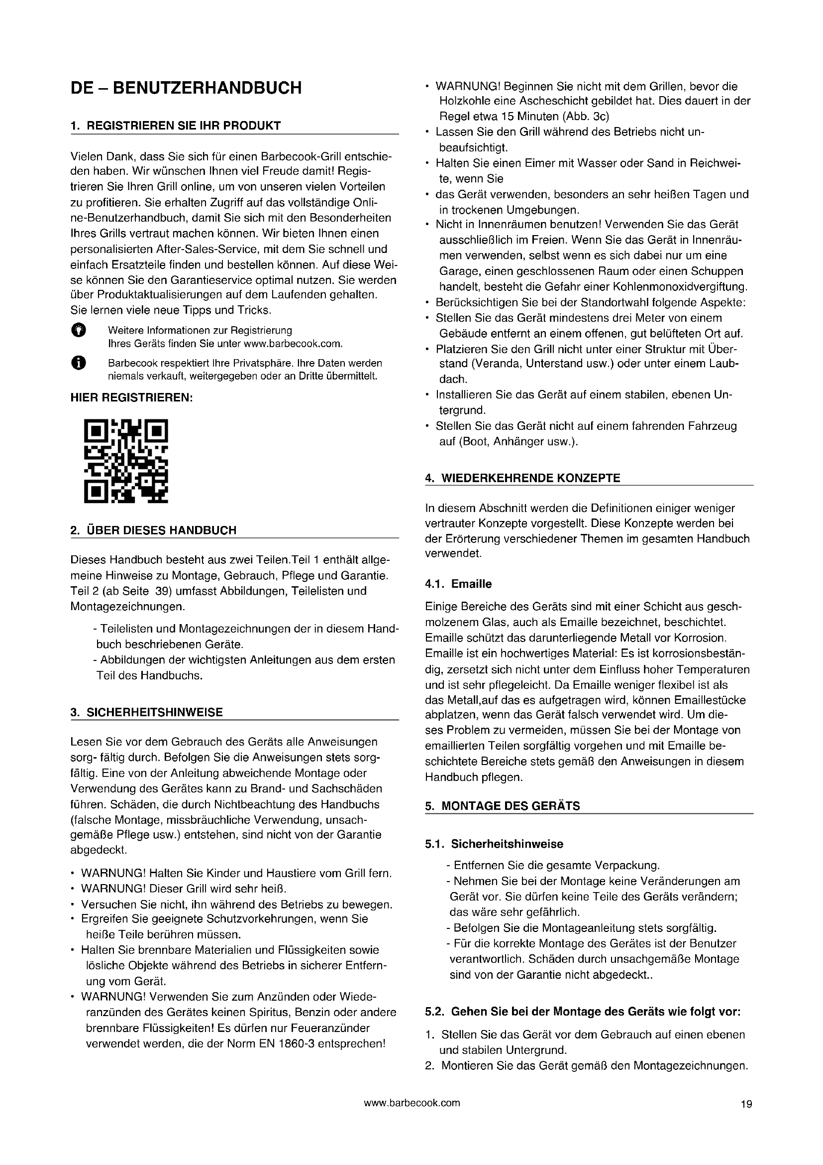 Vielen Dank, dass Sie sich für einen Barbecook-Grill entschie- den haben. Wir wünschen Ihnen viel Freude damit! Regis- trieren Sie Ihren Grill online, um von unseren vielen Vorteilen zu protieren. Sie erhalten Zugriff auf das vollständige Onli- ne-Benutzerhandbuch, damit Sie sich mit den Besonderheiten Ihres Grills vertraut machen können. Wir bieten Ihnen einen personalisierten After-Sales-Service, mit dem Sie schnell und einfach Ersatzteile nden und bestellen können. Auf diese Wei- se können Sie den Garantieservice optimal nutzen. Sie werden über Produktaktualisierungen auf dem Laufenden gehalten. Sie lernen viele neue Tipps und Tricks.