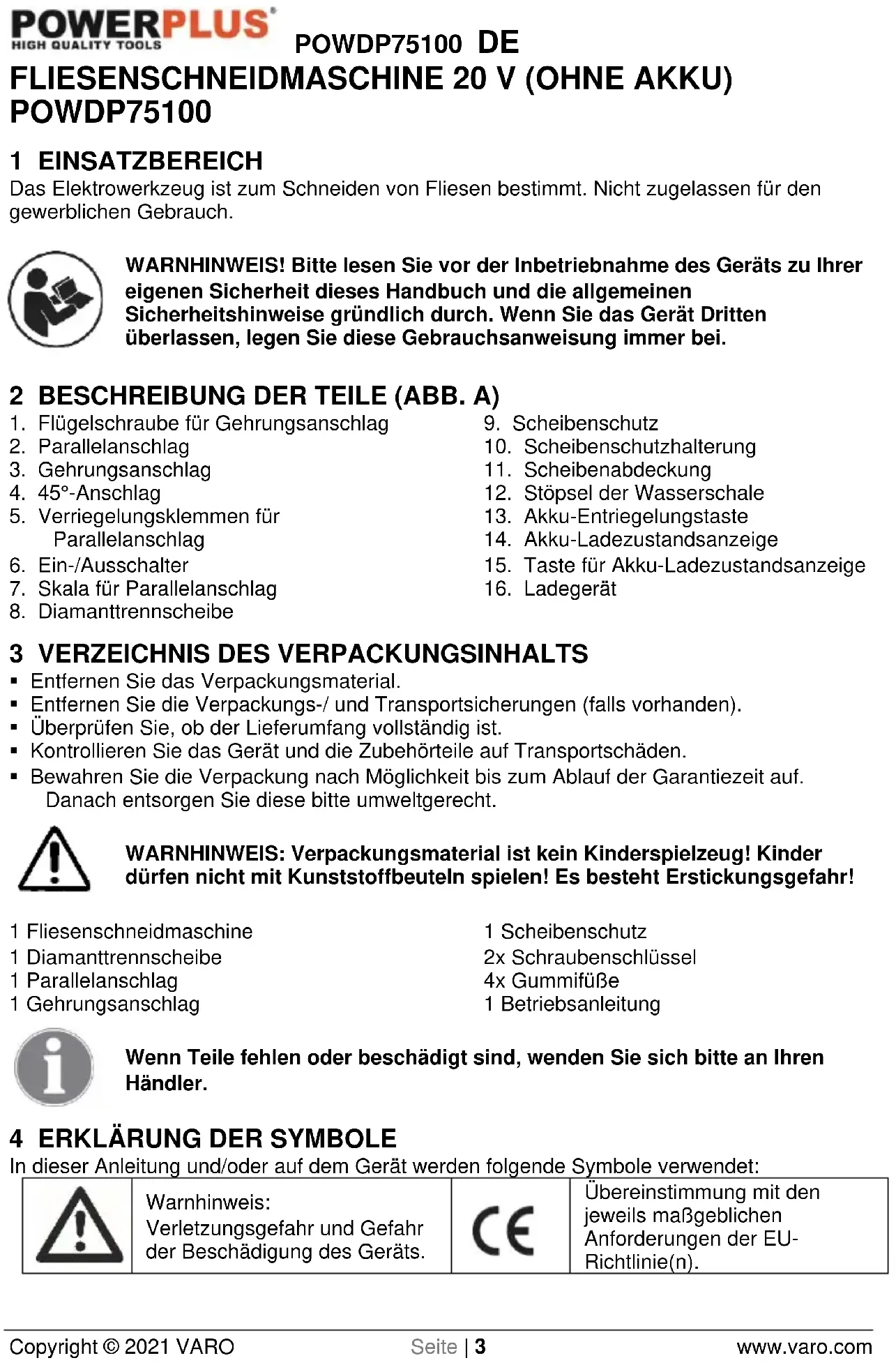 Hiermit erklären wir, VARO – Vic. Van Rompuy N.V., Joseph Van Instraat 9, B-2500 Lier, Belgien, dass das nachfolgend bezeichnete Gerät Bezeichnung des Geräts: Fliesenschneidmaschine – Akkubetrieben Marke: PowerPlus Modell-Nr.: POWDP75100 den grundlegenden Anforderungen und anderen einschlägigen Bestimmungen der entsprechenden EU-Richtlinien auf der Grundlage der harmonisierten EU-Normen entspricht. Bei einer nicht mit uns abgestimmten Änderung des Geräts verliert diese Erklärung ihre Gültigkeit. EU-Richtlinien (einschließlich ihrer etwaigen Änderungen, bis zum Datum der Unterschrift): 2011/65/EU 2006/42/EC 2014/30/EU Harmonisierte EU-Normen (einschließlich ihrer etwaigen Änderungen, bis zum Datum der Unterschrift): EN62841-1 : 2015 EN55014-1 : 2017 EN55014-2 : 2015 Halter der Technischen Dokumentation: Philippe Vankerkhove, VARO – Vic. Van Rompuy N.V. Der Unterzeichner handelt im Namen der Geschäftsführung des Unternehmens, Ludo Mertens Zulassungsabteilung – Compliance Manager 09/11/2020, Lier - BelgiumPOWDP75100 ES Copyright © 2021 VARO P á g i n a | 1 www.varo.com 1 APLICACIÓN .................................................................................. 3