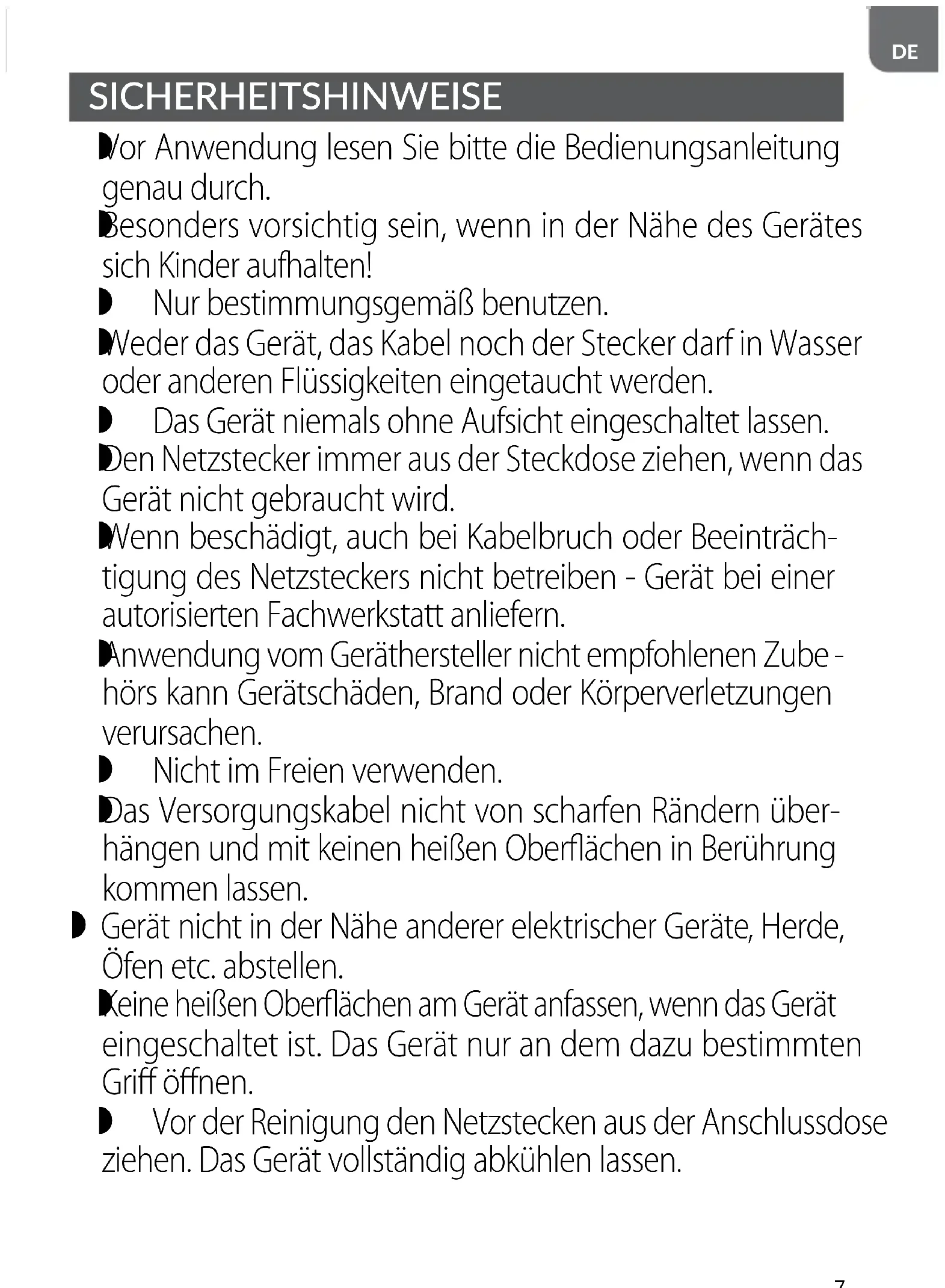 Keine heißen Oberflächen am Gerät anfassen, wenn das Gerät eingeschaltet ist. Das Gerät nur an dem dazu bestimmten Griff öffnen. Vor der Reinigung den Netzstecken aus der Anschlussdose ziehen. Das Gerät vollständig abkühlen lassen.8