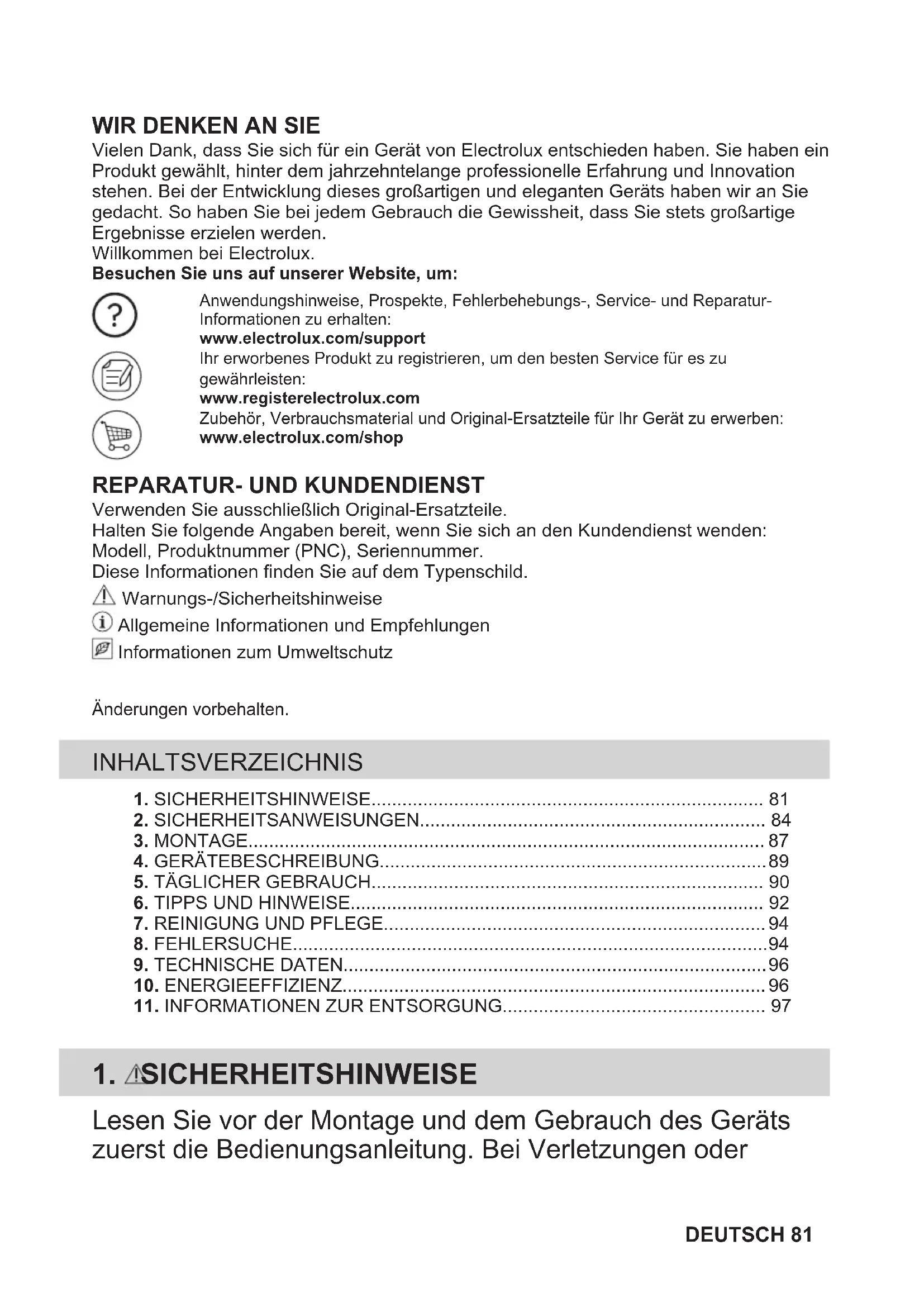 Verwenden Sie ausschließlich Original-Ersatzteile.Halten Sie folgende Angaben bereit, wenn Sie sich an den Kundendienst wenden:Modell, Produktnummer (PNC), Seriennummer.Diese Informationen finden Sie auf dem Typenschild. Warnungs-/Sicherheitshinweise Allgemeine Informationen und Empfehlungen Informationen zum UmweltschutzÄnderungen vorbehalten. INHALTSVERZEICHNIS