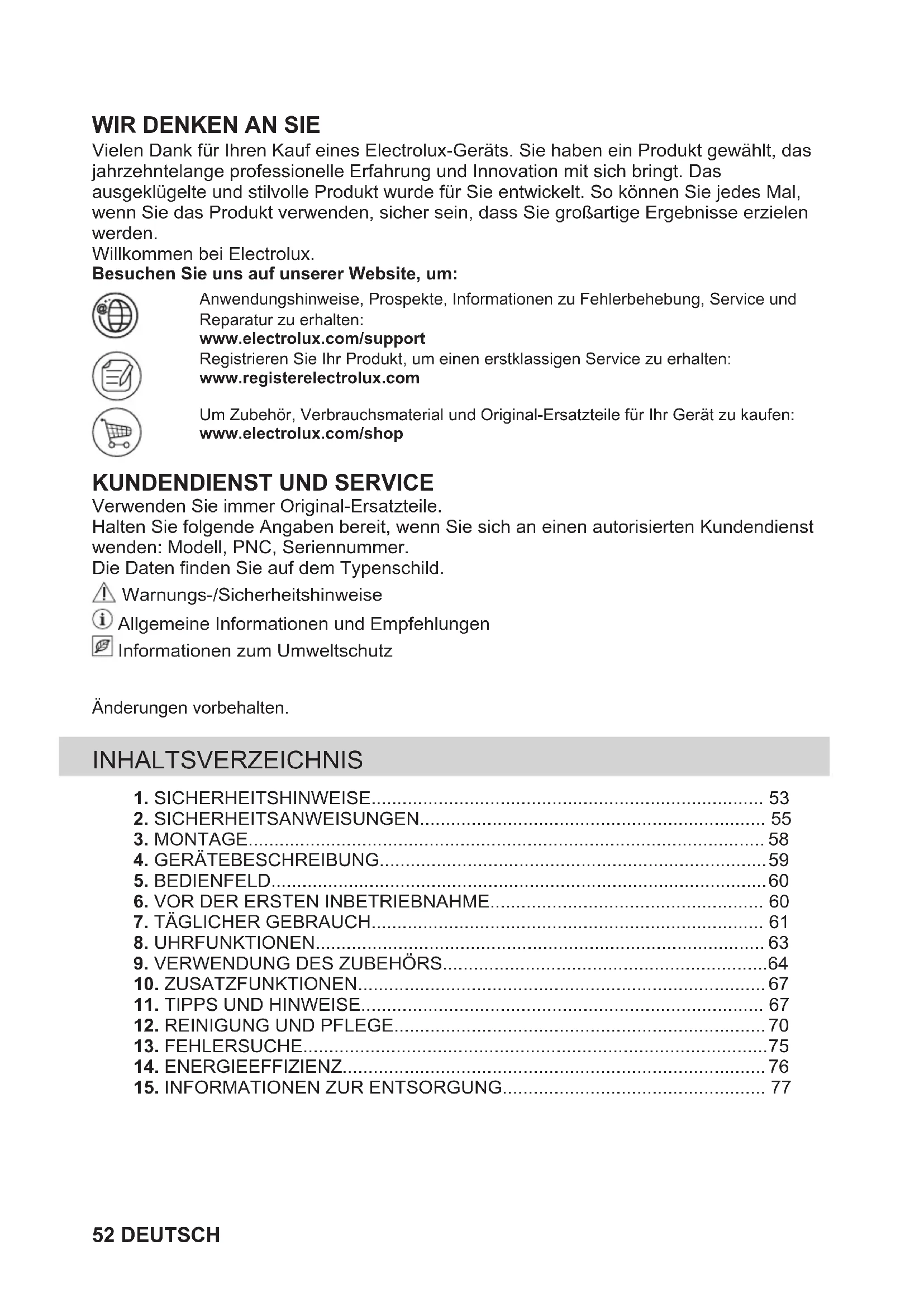 Vielen Dank für Ihren Kauf eines Electrolux-Geräts. Sie haben ein Produkt gewählt, das jahrzehntelange professionelle Erfahrung und Innovation mit sich bringt. Das ausgeklügelte und stilvolle Produkt wurde für Sie entwickelt. So können Sie jedes Mal, wenn Sie das Produkt verwenden, sicher sein, dass Sie großartige Ergebnisse erzielen werden. Willkommen bei Electrolux. Besuchen Sie uns auf unserer Website, um: Anwendungshinweise, Prospekte, Informationen zu Fehlerbehebung, Service undReparatur zu erhalten:www.electrolux.com/supportRegistrieren Sie Ihr Produkt, um einen erstklassigen Service zu erhalten:www.registerelectrolux.comUm Zubehör, Verbrauchsmaterial und Original-Ersatzteile für Ihr Gerät zu kaufen:www.electrolux.com/shop