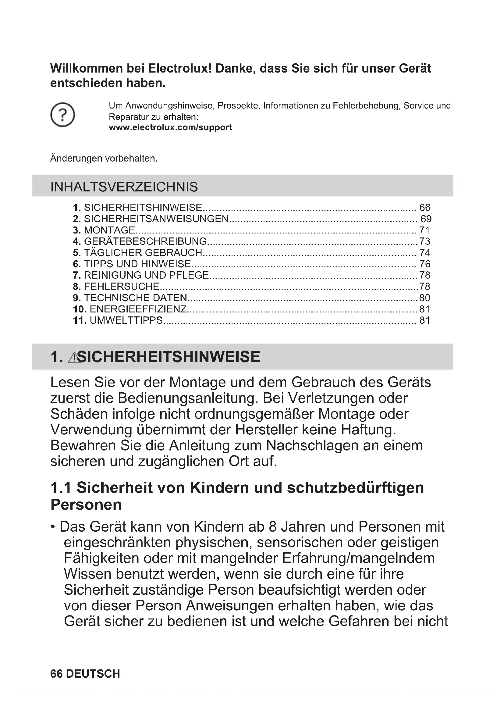 Recyceln Sie Materialien mit dem Symbol . Entsorgen Sie die Verpackung in den entsprechenden Recyclingbehältern. Recyceln Sie zum Umwelt- und Gesundheitsschutz elektrische und elektronische Geräte. Entsorgen Sie Geräte mit diesem Symbol nicht mit dem Hausmüll. Bringen Sie das Gerät zu Ihrer örtlichen Sammelstelle oder wenden Sie sich an Ihr Gemeindeamt. DEUTSCH 81Ti diamo il benvenuto in Electrolux! Grazie per aver scelto di acquistare questo prodotto. Ricevere consigli, scaricare i nostri opuscoli, eliminare eventuali anomalie, ottenereinformazioni sull'assistenza e la riparazione:www.electrolux.com/supportCon riserva di modifiche. INDICE