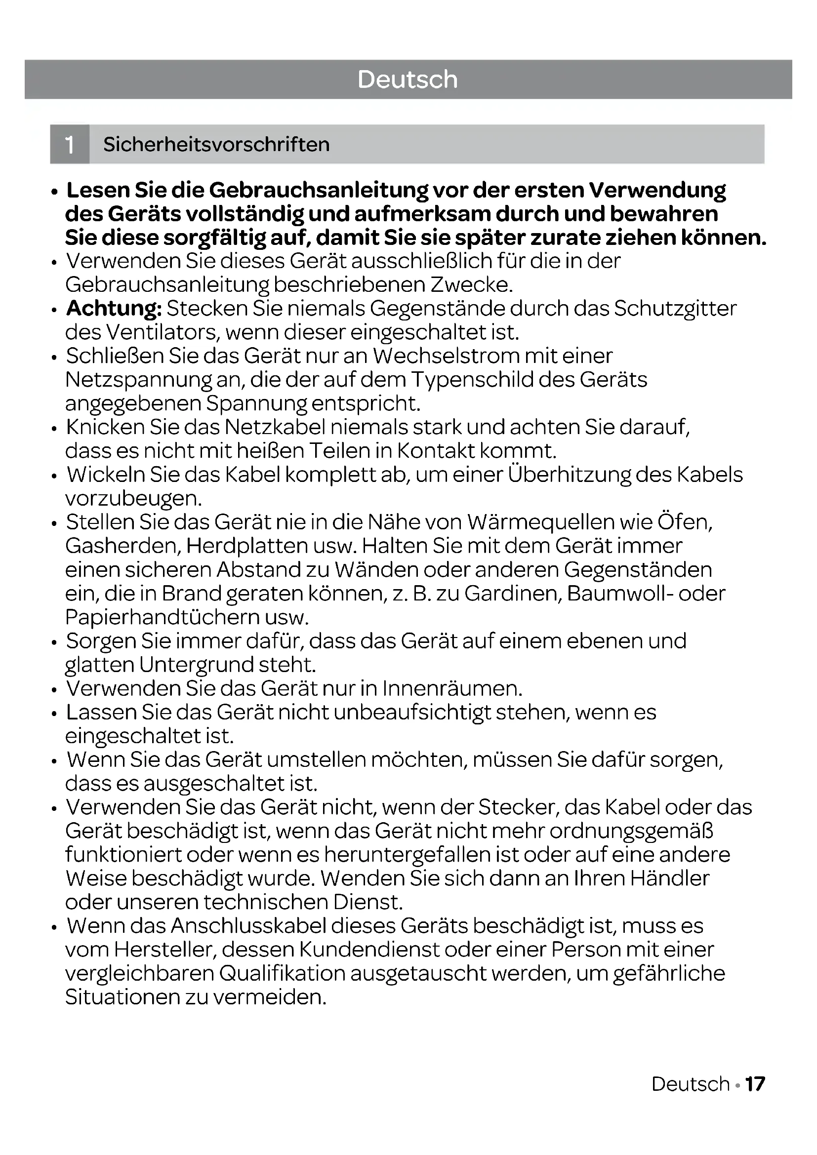 - Achtung: Stecken Sie niemals Gegenstände durch das Schutzgitter des Ventilators, wenn dieser eingeschaltet ist.