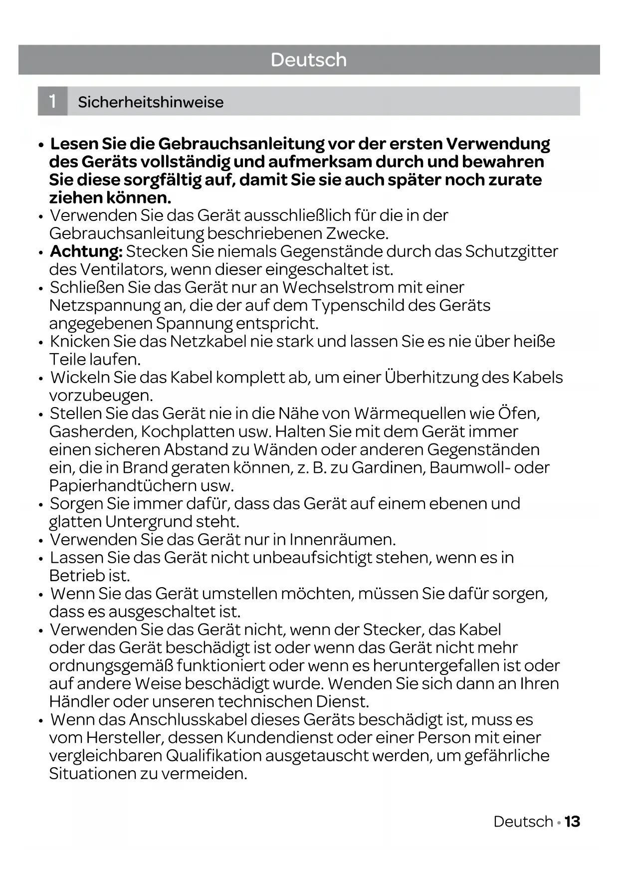 - Achtung: Stecken Sie niemals Gegenstände durch das Schutzgitter des Ventilators, wenn dieser eingeschaltet ist.