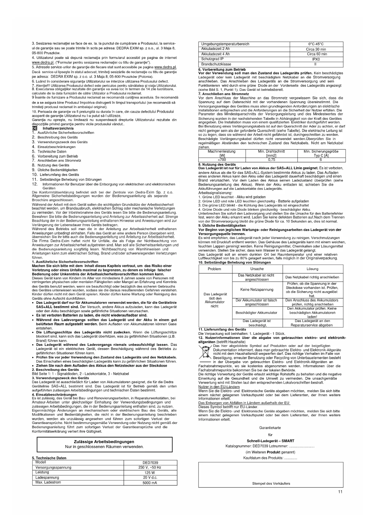 altgeräten (betrifft Haushalte) Das hier abgebildete Symbol auf Produkten oder auf der beigefügten Dokumentation informiert, dass man gebrauchte Elektro- und Elektronik-Altgeräte nicht mit dem Haushaltsmüll wegwerfen darf. Das richtige Verhalten im Falle von Beseitigung, erneuter Benutzung oder Recycling von Unterbauelementen besteht in der Übergabe von gebrauchten Elektro- und Elektronik-Altgeräten an Fachabnahmepunkte, wo sie kostenlos abgenommen werden. Informationen über die Fachabnahmepunkte bekommen Sie bei der lokalen Behörde. Die richtige Verwertung der Geräte erlaubt wichtige Rohstoffe zu behalten und die negative Einwirkung auf die Gesundheit und die Umwelt zu vermeiden. Die unsachgemäße Verwertung wird mit Strafen laut den entsprechenden Lokalvorschriften bestraft. Nutzer in den EU-Ländern Wenn Sie die Elektro- und Elektronische Geräte abgeben möchten, melden Sie sich bitte einem nächst gelegenen Verkaufspunkt oder bei dem Lieferanten, der Ihnen weitere Informationen erteilt. Das Entsorgen von Abfällen in Ländern außerhalb der EU Dieses Symbol betrifft nur EU-Länder. Wenn Sie die Elektro- und Elektronische Geräte abgeben möchten, melden Sie sich bitte einem nächst gelegenen Verkaufspunkt oder bei dem Lieferanten, der Ihnen weitere Informationen erteilt. Garantiekarte für Schnell-Ladegerät – SMART Katalognummer: DED7039 Lotnummer: .......................... (im Weiteren Produkt genannt) Kaufdatum des Produkts: ............. Stempel des Verkäufers12 Datum und Unterschrift des Verkäufers: ................................. Erklärung des Benutzers: Ich bestätige, dass ich über die Bedingungen der Garantie sowie Folgen der Nichtbeachtung von den in der Bedienungsanleitung und Garantiekarte enthaltenen Anweisungen informiert wurde. Die Bedingungen dieser Garantie sind mir bekannt, was ich mit meiner eigenhändigen Unterschrift bestätige: