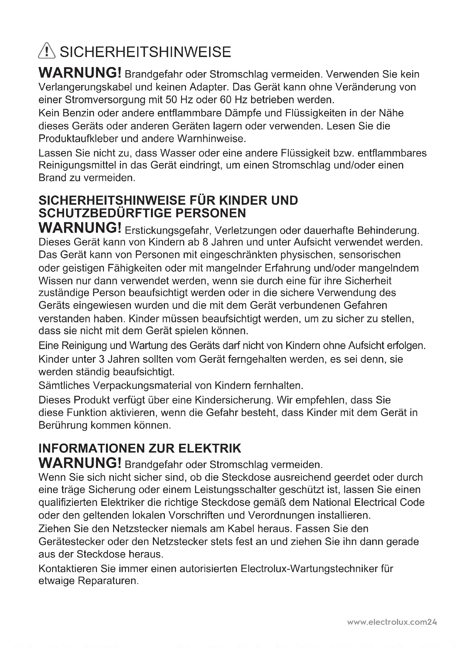 WARNUNG! Brandgefahr oder Stromschlag vermeiden. Wenn Sie sich nicht sicher sind, ob die Steckdose ausreichend geerdet oder durch eine träge Sicherung oder einem Leistungsschalter geschützt ist, lassen Sie einen qualizierten Elektriker die richtige Steckdose gemäß dem National Electrical Code oder den geltenden lokalen Vorschriften und Verordnungen installieren. Ziehen Sie den Netzstecker niemals am Kabel heraus. Fassen Sie den Gerätestecker oder den Netzstecker stets fest an und ziehen Sie ihn dann gerade aus der Steckdose heraus. Kontaktieren Sie immer einen autorisierten Electrolux-Wartungstechniker für etwaige Reparaturen.www.electrolux.com 25 Wenn das Steckergehäuse beschädigt ist, muss es durch einen neuen für dieses Gerät vorgesehenen Ersatzadapter von Electrolux ausgetauscht werden. Stellen Sie sicher, dass Sie das Gerät vor der Reinigung oder Wartung von der Steckdose trennen, um die Gefahr eines Stromschlag oder eines Brandes zu verhindern. SICHERHEITSVORKEHRUNGEN ACHTUNG! Verletzungs- oder Lebensgefahr! Nicht Ihre Finger oder Gegenstände in das Luftauslassgitter des Geräts stecken. Im Falle einer Störung (Funkenbildung, Brandgeruch etc.) stellen Sie den Betrieb sofort ein, ziehen Sie das Netzkabel ab und rufen Sie einen autorisierten Electrolux Techniker an. Das Gerät nicht mit nassen Händen bedienen. ACHTUNG! Gefahren oder schäden am gerät oder am eigentum vermeiden. Den Luftstrom nicht auf Kamine oder andere Wärmequellen richten, da dies zu einem Auammen führen kann. Nicht auf das Gerät steigen oder Gegenstände darauf ablegen. Keine Gegenstände am Gerät herabhängen lassen. Keine Behälter mit Flüssigkeiten auf das Gerät abstellen. Gerät am Netzteil AUSSCHALTEN, wenn es über einen längeren Zeitraum nicht verwendet wird. Betreiben Sie das Gerät nur mit installiertem Filter. Nicht das Lufteinlassgitter oder das Luftauslassgitter blockieren oder abdecken. Stellen Sie sicher, dass sich keine elektrischen bzw. elektronischen Geräte im Umfeld von 30 cm benden. Das Gerät ist nur mit dem vom Hersteller oder seinem Kundendienstmitarbeiter gelieferten Zubehörteilen zu verwenden. ENTSORGUNG Dieses Symbol auf dem Gerät oder auf der Verpackung zeigt an, dass das Gerät nicht im Hausmüll entsorgt werden darf. Bringen Sie Ihr Gerät zum Recyclen zu einer oziellen Sammelstelle oder zu einem Electrolux Kundendienst, der die elektrischen Teile sicher und fachgerecht entfernen und recyclen kann. Befolgen Sie die Vorschriften Ihres Landes für die getrennte Sammlung von Elektroprodukten. Dieses Produkt wurde mit Rücksicht auf die Umwelt hergestellt. Alle Kunststoteile sind für Recyclingzwecke markiert.