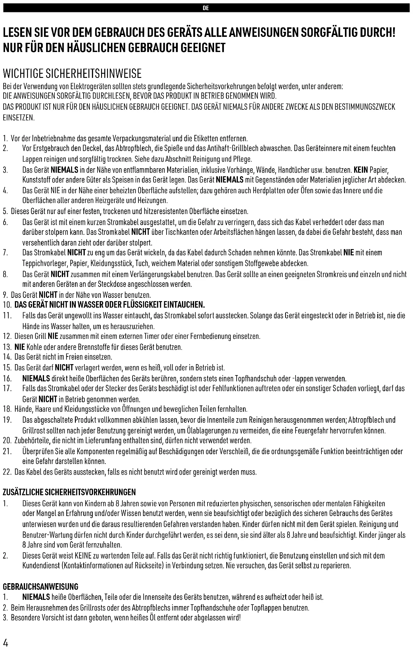 LESEN SIE VOR DEM GEBRAUCH DES GERÄTS ALLE ANWEISUNGEN SORGFÄLTIG DURCH! NUR FÜR DEN HÄUSLICHEN GEBRAUCH GEEIGNET WICHTIGE SICHERHEITSHINWEISE Bei der Verwendung von Elektrogeräten sollten stets grundlegende Sicherheitsvorkehrungen befolgt werden, unter anderem: DIE ANWEISUNGEN SORGFÄLTIG DURCHLESEN, BEVOR DAS PRODUKT IN BETRIEB GENOMMEN WIRD. DAS PRODUKT IST NUR FÜR DEN HÄUSLICHEN GEBRAUCH GEEIGNET. DAS GERÄT NIEMALS FÜR ANDERE ZWECKE ALS DEN BESTIMMUNGSZWECK EINSETZEN.