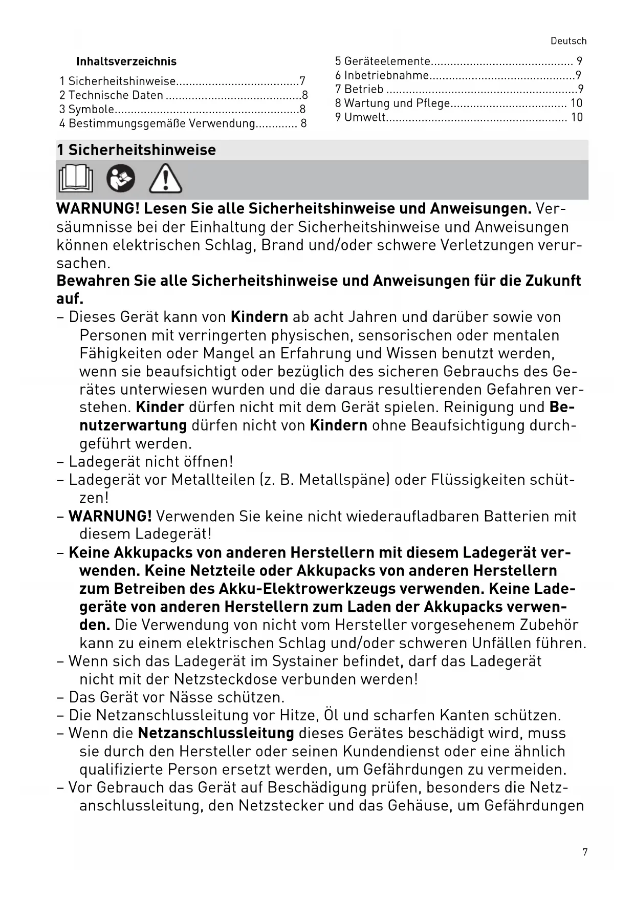8 Wartung und Pflege.................................... 10 9 Umwelt........................................................ 10 1 Sicherheitshinweise WARNUNG! Lesen Sie alle Sicherheitshinweise und Anweisungen. Ver säumnisse bei der Einhaltung der Sicherheitshinweise und Anweisungen können elektrischen Schlag, Brand und/oder schwere Verletzungen verur sachen. Bewahren Sie alle Sicherheitshinweise und Anweisungen für die Zukunft auf. – Dieses Gerät kann von Kindern ab acht Jahren und darüber sowie von Personen mit verringerten physischen, sensorischen oder mentalen Fähigkeiten oder Mangel an Erfahrung und Wissen benutzt werden, wenn sie beaufsichtigt oder bezüglich des sicheren Gebrauchs des Ge rätes unterwiesen wurden und die daraus resultierenden Gefahren ver stehen. Kinder dürfen nicht mit dem Gerät spielen. Reinigung und Be nutzerwartung dürfen nicht von Kindern ohne Beaufsichtigung durch geführt werden. – Ladegerät nicht öffnen! – Ladegerät vor Metallteilen (z. B. Metallspäne) oder Flüssigkeiten schüt zen! – WARNUNG! Verwenden Sie keine nicht wiederaufladbaren Batterien mit diesem Ladegerät! – Keine Akkupacks von anderen Herstellern mit diesem Ladegerät ver wenden. Keine Netzteile oder Akkupacks von anderen Herstellern zum Betreiben des Akku-Elektrowerkzeugs verwenden. Keine Lade geräte von anderen Herstellern zum Laden der Akkupacks verwen den. Die Verwendung von nicht vom Hersteller vorgesehenem Zubehör kann zu einem elektrischen Schlag und/oder schweren Unfällen führen. – Wenn sich das Ladegerät im Systainer befindet, darf das Ladegerät nicht mit der Netzsteckdose verbunden werden! – Das Gerät vor Nässe schützen. – Die Netzanschlussleitung vor Hitze, Öl und scharfen Kanten schützen. – Wenn die Netzanschlussleitung dieses Gerätes beschädigt wird, muss sie durch den Hersteller oder seinen Kundendienst oder eine ähnlich qualifizierte Person ersetzt werden, um Gefährdungen zu vermeiden. – Vor Gebrauch das Gerät auf Beschädigung prüfen, besonders die Netz anschlussleitung, den Netzstecker und das Gehäuse, um Gefährdungen Deutsch 7zu vermeiden. Bei Beschädigung ausschließlich von einer autorisierten Kundendienstwerkstatt reparieren lassen. – Lüftungsschlitze des Ladegeräts nicht abdecken. Das Ladegerät kann sonst überhitzen und nicht ordnungsgemäß funktionieren. – Bei Beschädigung und unsachgemäßem Gebrauch des Akkupacks können Dämpfe austreten. Die Dämpfe können die Atemwege reizen. Führen Sie Frischluft zu und suchen Sie bei Beschwerden einen Arzt auf. 2 Technische Daten Ladegerät SCA 16 TCL 6 TCL 6 DUO Netzspannung (Eingang) 220 - 240 V~ 220 - 240 V~ 220 - 240 V~ Netzfrequenz 50 - 60 Hz 50 - 60 Hz 50 - 60 Hz Ladespannung (Aus gang) 10,8 - 18 V 10,8 - 18 V Output1: 10,8 - 18 V Output2: 10,8 - 18 V Ladestrom max. 16 A max. 6 A Output1: max. 6 A Output2: max. 6 A Ladezeiten für BP und BPC-Akkupacks, ca. 4,2 Ah 76 min 76 min 76 min 3,0 Ah* / 3,1 Ah* 33 min 33 min 33 min 4,0 Ah* 32 min 32 min 32 min 5,0 Ah* / 5,2 Ah* 33 min 45 min 45 min 6,2 Ah* 32 min 53 min 53 min Zulässiger Ladetempe raturbereich des Akku packs -5 °C bis +55 °C Temperaturüberwa chung mittels NTC-Widerstand 3 Symbole Warnung vor allgemeiner Gefahr Warnung vor Stromschlag Betriebsanleitung, Sicherheitshinweise lesen! Betriebsanleitung, Sicherheitshinwei se lesen! Nur für Innengebrauch geeignet