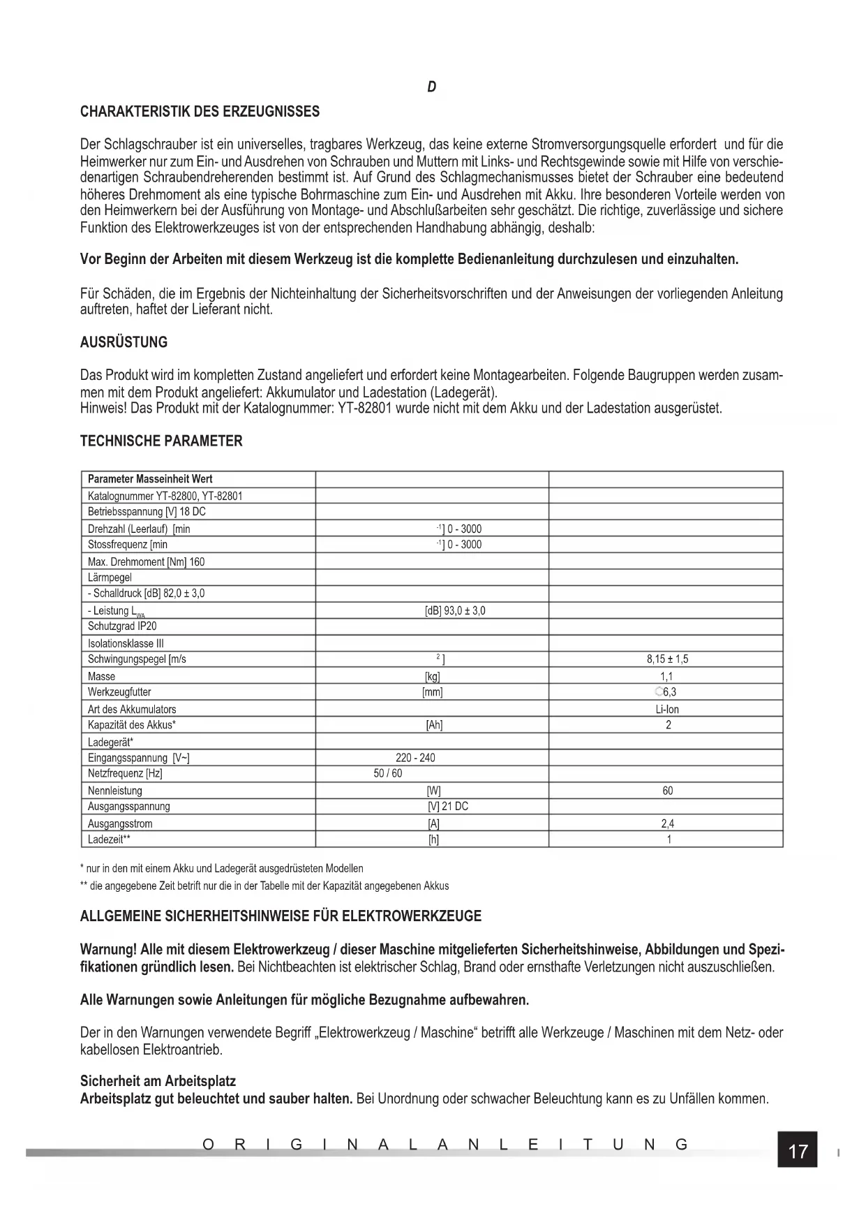 Der Schlagschrauber ist ein universelles, tragbares Werkzeug, das keine externe Stromversorgungsquelle erfordert und für die Heimwerker nur zum Ein- und Ausdrehen von Schrauben und Muttern mit Links- und Rechtsgewinde sowie mit Hilfe von verschie- denartigen Schraubendreherenden bestimmt ist. Auf Grund des Schlagmechanismusses bietet der Schrauber eine bedeutend höheres Drehmoment als eine typische Bohrmaschine zum Ein- und Ausdrehen mit Akku. Ihre besonderen Vorteile werden von den Heimwerkern bei der Ausführung von Montage- und Abschlußarbeiten sehr geschätzt. Die richtige, zuverlässige und sichere Funktion des Elektrowerkzeuges ist von der entsprechenden Handhabung abhängig, deshalb: Vor Beginn der Arbeiten mit diesem Werkzeug ist die komplette Bedienanleitung durchzulesen und einzuhalten. Für Schäden, die im Ergebnis der Nichteinhaltung der Sicherheitsvorschriften und der Anweisungen der vorliegenden Anleitung auftreten, haftet der Lieferant nicht. AUSRÜSTUNG Das Produkt wird im kompletten Zustand angeliefert und erfordert keine Montagearbeiten. Folgende Baugruppen werden zusam- men mit dem Produkt angeliefert: Akkumulator und Ladestation (Ladegerät). Hinweis! Das Produkt mit der Katalognummer: YT-82801 wurde nicht mit dem Akku und der Ladestation ausgerüstet. TECHNISCHE PARAMETER Parameter Masseinheit Wert Katalognummer YT-82800, YT-82801 Betriebsspannung [V] 18 DC Drehzahl (Leerlauf) [min