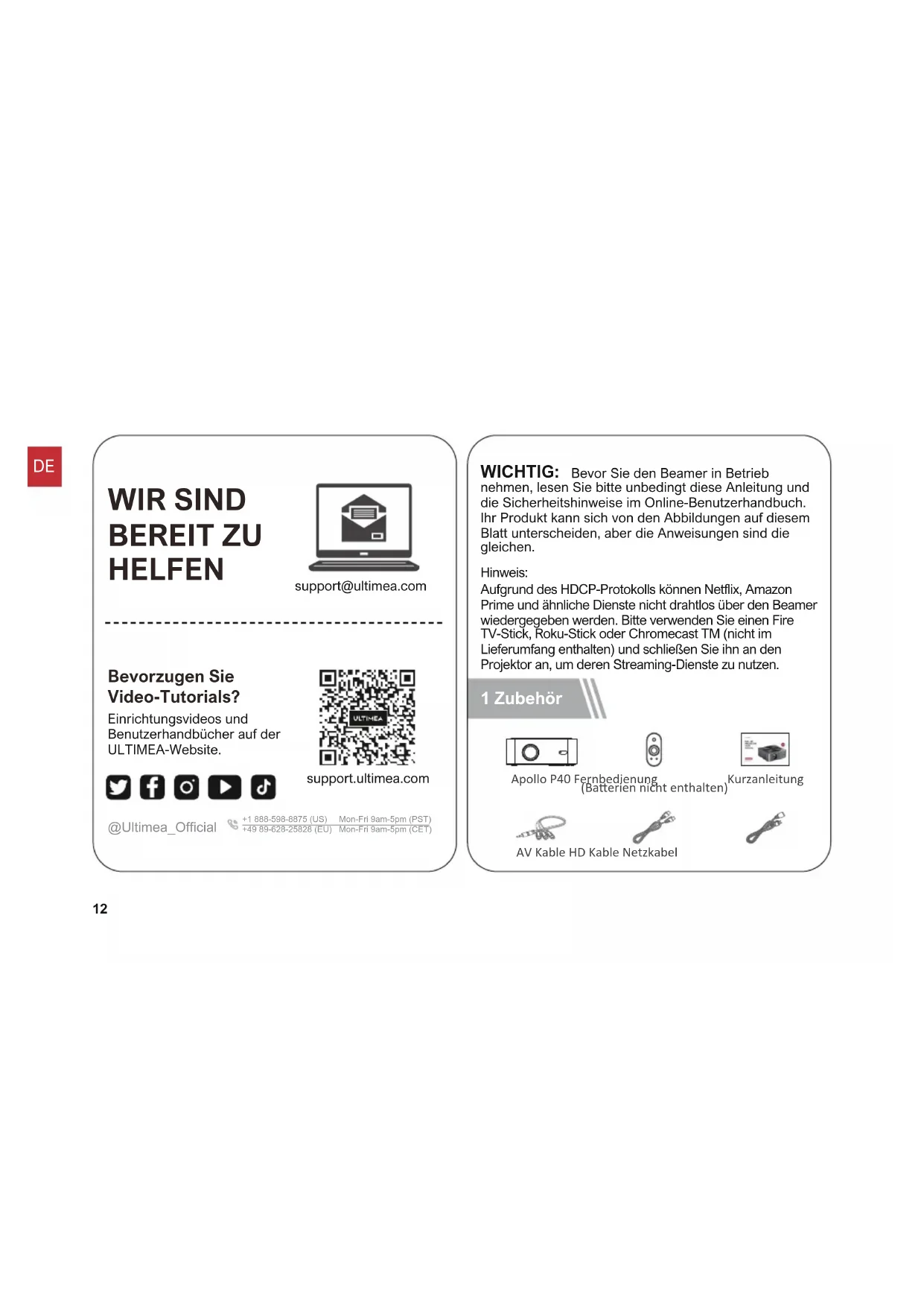 @Ultimea_Official 1080P 1 Zubehör WICHTIG: Bevor Sie den Beamer in Betrieb nehmen, lesen Sie bitte unbedingt diese Anleitung und die Sicherheitshinweise im Online-Benutzerhandbuch. Ihr Produkt kann sich von den Abbildungen auf diesem Blatt unterscheiden, aber die Anweisungen sind die gleichen. Apollo P40 Fernbedienung (Baerien nicht enthalten) Kurzanleitung AV Kable HD Kable Netzkabel Hinweis: Aufgrund des HDCP-Protokolls können Netflix, Amazon Prime und ähnliche Dienste nicht drahtlos über den Beamer wiedergegeben werden. Bitte verwenden Sie einen Fire TV-Stick, Roku-Stick oder Chromecast TM (nicht im Lieferumfang enthalten) und schließen Sie ihn an den Projektor an, um deren Streaming-Dienste zu nutzen. support@ultimea.com WIR SIND BEREIT ZU HELFEN Einrichtungsvideos und Benutzerhandbücher auf der ULTIMEA-Website. Bevorzugen Sie Video-Tutorials? support.ultimea.com +1 888-598-8875 (US) Mon-Fri 9am-5pm (PST)+49 89-628-25828 (EU) Mon-Fri 9am-5pm (CET)13