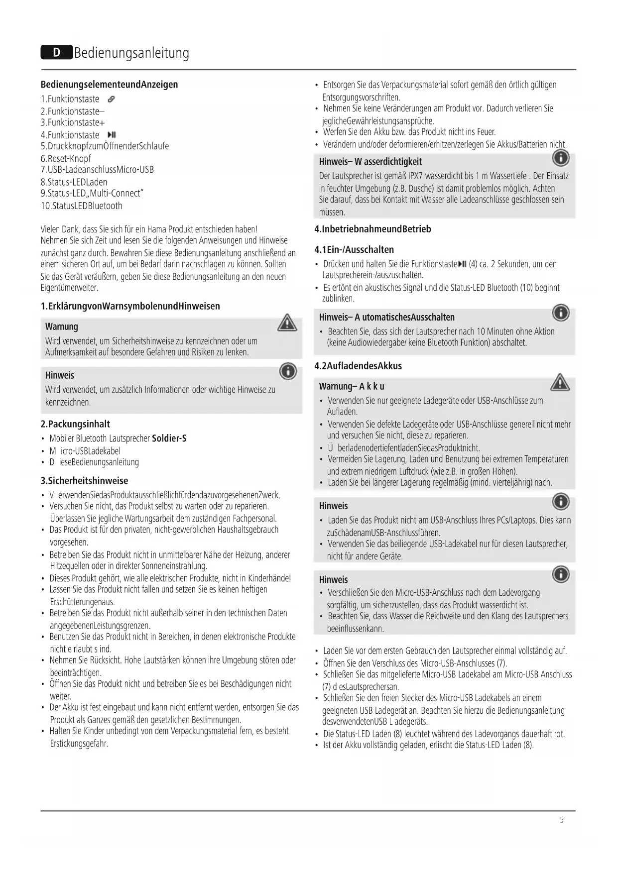 - Verändern und/oder deformieren/erhitzen/zerlegen Sie Akkus/Batteriennicht. Hinweis –Wasserdichtigkeit Der Lautsprecher ist gemäßIPX7 wasserdicht bis1mWassertiefe .Der Einsatz in feuchter Umgebung (z.B. Dusche) istdamit problemlos möglich. Achten Sie darauf ,dass bei Kontaktmit WasseralleLadeanschlüsse geschlossensein müssen.