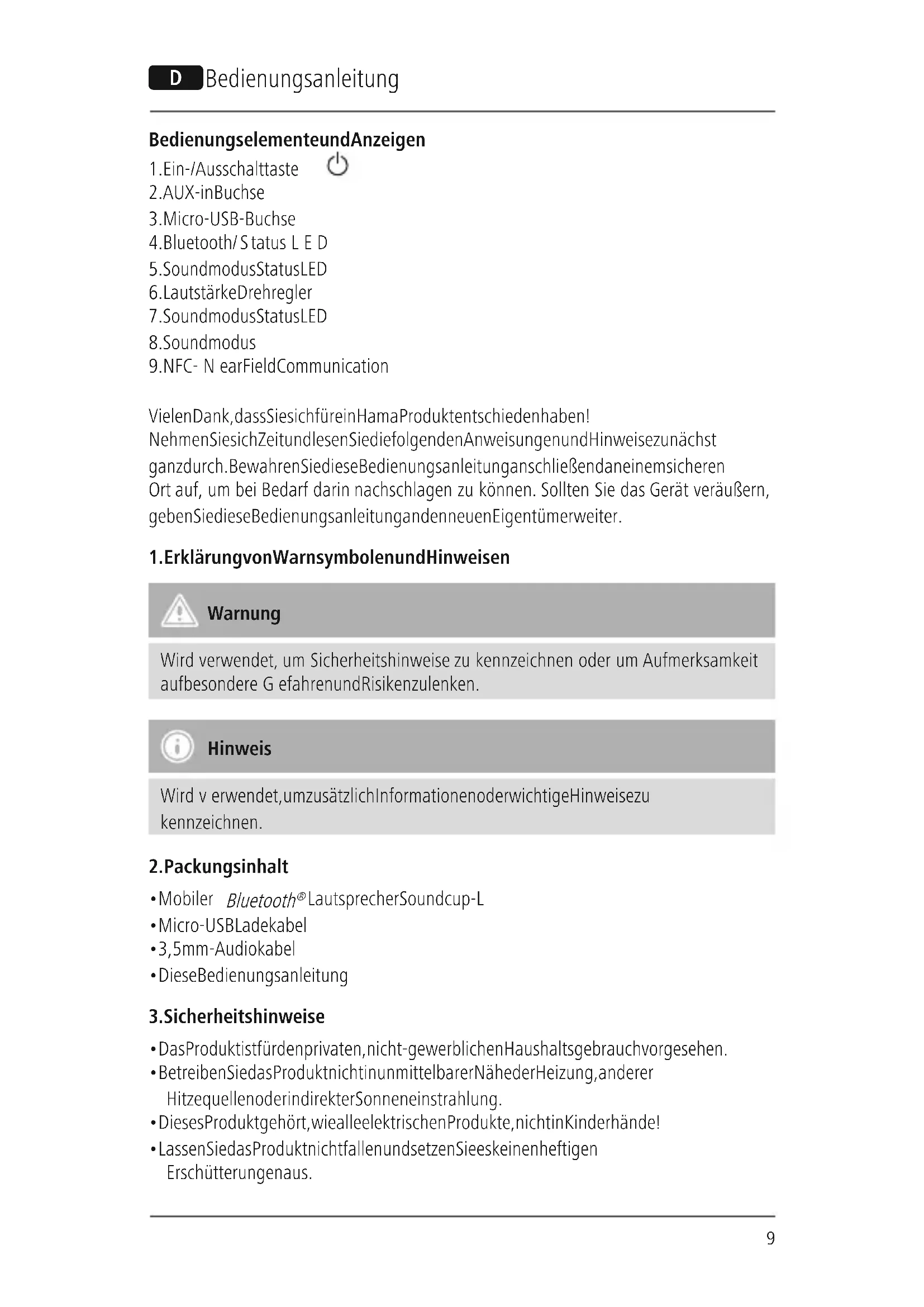 Vielen Dank, dass Sie sich für ein Hama Produkt entschieden haben! Nehmen Sie sich Zeit und lesen Sie die folgenden Anweisungen und Hinweise zunächst ganz durch. Bewahren Sie diese Bedienungsanleitung anschließend an einem sicheren Ort auf,umbei Bedarf darin nachschlagen zu können. Sollten Sie das Gerät veräußern, geben Sie diese Bedienungsanleitung an den neuen Eigentümer weiter.