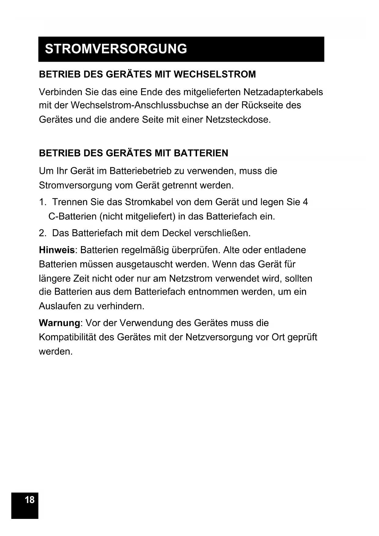 Hinweis: Batterien regelmäßig überprüfen. Alte oder entladene Batterien müssen ausgetauscht werden. Wenn das Gerät für längere Zeit nicht oder nur am Netzstrom verwendet wird, sollten die Batterien aus dem Batteriefach entnommen werden, um ein Auslaufen zu verhindern. Warnung: Vor der Verwendung des Gerätes muss die Kompatibilität des Gerätes mit der Netzversorgung vor Ort geprüft werden.19 BATTERIE-SICHERHEITSANWEISUNGEN: ●BatterienvonKindernundHaustierenfernhalten. ●BeimEinlegenderBatteriendierichtigePolarität(+/-)beachten.Ein fehlerhaftes Einlegen der Batterien kann zu Verletzungen und/oder Sachschaden führen. ●EntfernenSiealteoderentladeneBatterienausdemGerät. Entfernen Sie die Batterien, wenn das Gerät für einen längeren Zeitraum nicht verwendet wird, um Schaden aufgrund von rostigen oder korrodierten Batterien zu vermeiden. ●SetzenSieBatterienkeinemFeueroderanderenHitzequellenaus. ●Batterieentsorgung:AlteoderentladeneBatterienmüssenunter Einhaltung der anwendbaren Gesetze ordnungsgemäß recycelt oder entsorgt werden. Für detaillierte Informationen wenden Sie sich an die für Feststoffabfall zuständige Behörde in Ihrer Nähe. ●BefolgenSiedieAnweisungenzurSicherheit,Nutzungund Entsorgung des Herstellers.20 BETRIEBSANWEISUNGEN Ein- oder Ausschalten