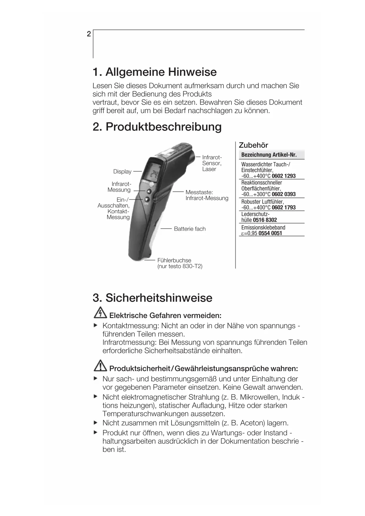 Elektrische Gefahren vermeiden: Kontaktmessung: Nicht an oder in der Nähe von spannungs - führenden Teilen messen. Infrarotmessung: Bei Messung von spannungs führenden Teilen erforderliche Sicherheitsabstände einhalten. Produktsicherheit / Gewährleistungsansprüche wahren: Nur sach- und bestimmungsgemäß und unter Einhaltung der vor gegebenen Parameter einsetzen. Keine Gewalt anwenden. Nicht elektromagnetischer Strahlung (z. B. Mikrowellen, Induk - tions heizungen), statischer Aufladung, Hitze oder starken Temperaturschwankungen aussetzen. Nicht zusammen mit Lösungsmitteln (z. B. Aceton) lagern. Produkt nur öffnen, wenn dies zu Wartungs- oder Instand - haltungsarbeiten ausdrücklich in der Dokumentation beschrie - ben ist. Infrarot- Sensor, Laser Batterie fach Display Ein-/ Ausschalten, Kontakt- Messung Messtaste: Infrarot-Messung Infrarot- Messung Fühlerbuchse (nur testo 830-T2) Zubehör Bezeichnung Artikel-Nr. Wasserdichter Tauch-/ Einstechfühler, -60...+400°C 0602 1293 Reaktionsschneller Oberflächenfühler, -60...+300°C 0602 0393 Robuster Luftfühler, -60...+400°C 0602 1793 Lederschutz- hülle 0516 8302 Emissionsklebeband ε =0,95 0554 00513 Laserstrahlung! Nicht in den Laserstrahl blicken. Fachgerecht entsorgen: Defekte Akkus / leere Batterien an den dafür vorgesehenen Sammelstellen abgeben. Produkt nach Ende der Nutzungszeit direkt an Testo senden. Wir sorgen für eine umwelt schonende Entsorgung.