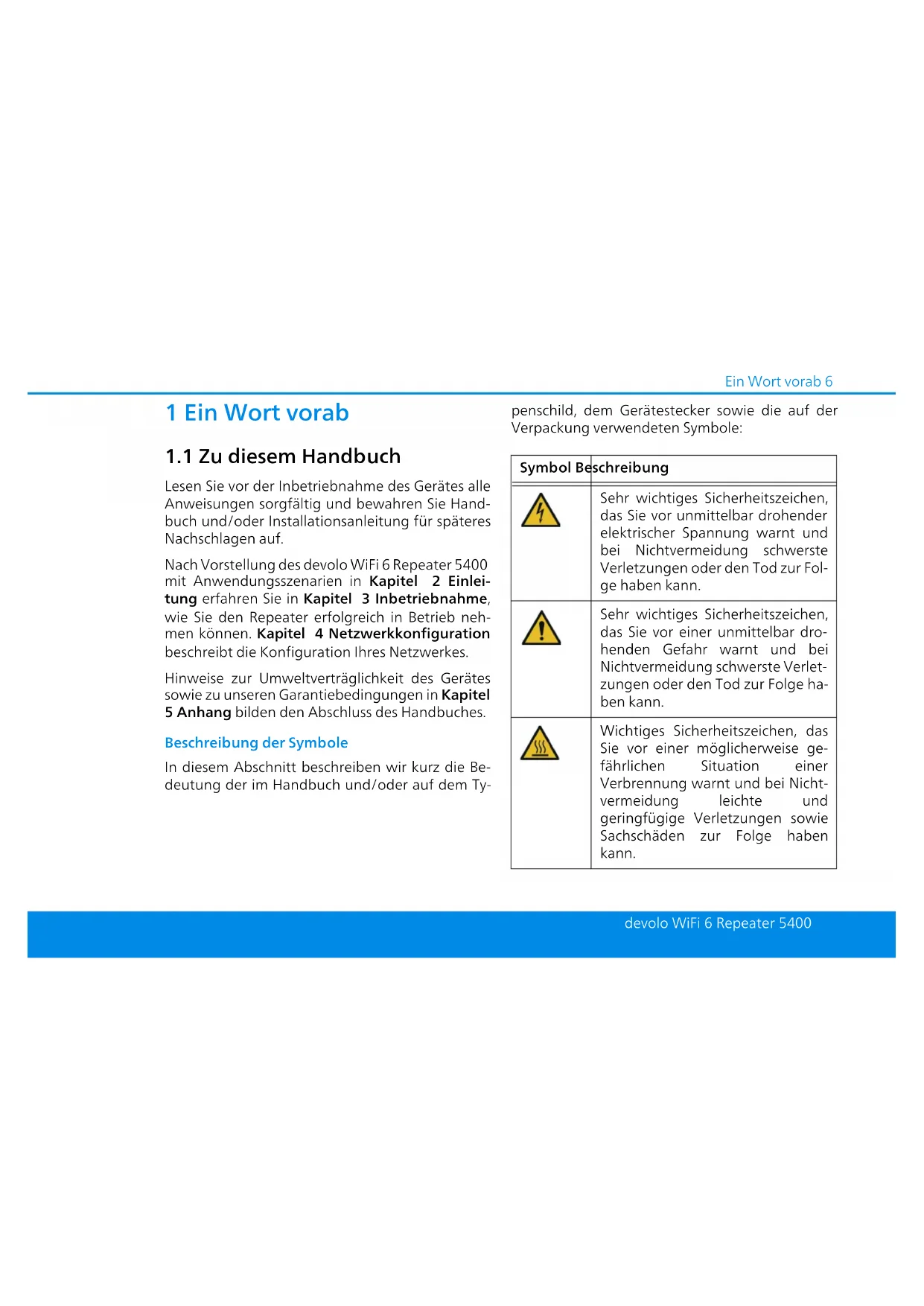 Lesen Sie vor der Inbetriebnahme des Gerätes alle Anweisungen sorgfältig und bewahren Sie Hand- buch und/oder Installationsanleitung für späteres Nachschlagen auf. Nach Vorstellung des devolo WiFi 6 Repeater 5400 mit Anwendungsszenarien in Kapitel 2 Einlei- tung erfahren Sie in Kapitel 3 Inbetriebnahme, wie Sie den Repeater erfolgreich in Betrieb neh- men können. Kapitel 4 Netzwerkkonfiguration beschreibt die Konfiguration Ihres Netzwerkes. Hinweise zur Umweltverträglichkeit des Gerätes sowie zu unseren Garantiebedingungen in Kapitel 5 Anhang bilden den Abschluss des Handbuches. Beschreibung der Symbole In diesem Abschnitt beschreiben wir kurz die Be- deutung der im Handbuch und/oder auf dem Ty- penschild, dem Gerätestecker sowie die auf der Verpackung verwendeten Symbole: Symbol Beschreibung Sehr wichtiges Sicherheitszeichen, das Sie vor unmittelbar drohender elektrischer Spannung warnt und bei Nichtvermeidung schwerste Verletzungen oder den Tod zur Fol- ge haben kann. Sehr wichtiges Sicherheitszeichen, das Sie vor einer unmittelbar dro- henden Gefahr warnt und bei Nichtvermeidung schwerste Verlet- zungen oder den Tod zur Folge ha- ben kann. Wichtiges Sicherheitszeichen, das Sie vor einer möglicherweise ge- fährlichen Situation einer Verbrennung warnt und bei Nicht- vermeidung leichte und geringfügige Verletzungen sowie Sachschäden zur Folge haben kann. WiFi_6_Repeater_5400.book Seite 6 Dienstag, 31. Mai 2022 6:00 187 Ein Wort vorab devolo WiFi 6 Repeater 5400 Wichtiges Sicherheitszeichen, das Sie vor einer möglicherweise ge- fährlichen Situation eines Hinder- nisses am Boden warnt und bei Nichtbeachtung Verletzungen zur Folge haben kann. Wichtiger Hinweis, dessen Beach- tung empfehlenswert ist und bei Nichtbeachtung möglicherweise zu Sachschäden führen kann. Das Gerät darf nur in trockenen und geschlossenen Räumen ver- wendet werden. Nur zutreffend bei Geräten mit WLAN im 5-GHz-Band: WLAN-Verbindungen im 5-GHz- Band von 5,15 bis 5,35 GHz sind ausschließlich für den Betrieb in- nerhalb geschlossener Räume be- stimmt. Symbol Beschreibung Das Gerät ist ein Produkt der Schutzklasse II. Alle elektrisch leitfä- higen (aus Metall bestehenden) Gehäuseteile, die im Betrieb und während der Wartung im Fehlerfall Spannung aufnehmen können, sind durch eine verstärkte Isolie- rung von spannungsführenden Ele- menten getrennt. Mit der CE-Kennzeichnung erklärt der Hersteller/Inverkehrbringer, dass das Produkt allen geltenden europäischen Vorschriften ent- spricht und es den vorgeschrieben- en Konformitätsbewertungsver- fahren unterzogen wurde. Symbol Beschreibung WiFi_6_Repeater_5400.book Seite 7 Dienstag, 31. Mai 2022 6:00 18Ein Wort vorab 8 devolo WiFi 6 Repeater 5400