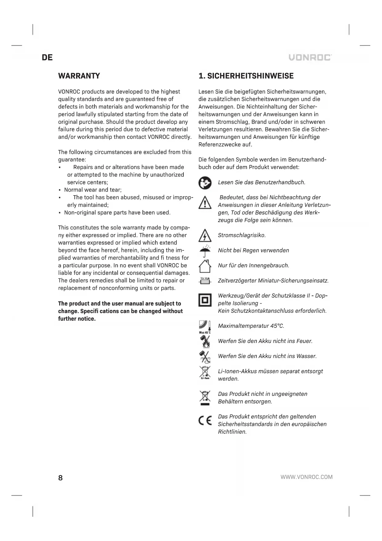 - Es wurden keine Originalersatzteile verwendet. Dies ist die einzige ausdrückliche oder stillschwei- gende Garantie, die das Unternehmen übernimmt. Es gibt keine weiteren ausdrücklichen oder stillschweigenden Garantien, die über die hierin enthaltenen Angaben hinausgehen, einschließlich der stillschweigenden Garantien der Gebrauchs- tauglichkeit und Eignung für einen bestimmten Zweck. VONROC haftet in keinem Fall für zufällige Schäden oder Folgeschäden. Die Rechtsmittel des Händlers beschränken sich auf die Reparatur oder den Austausch der nicht konformen Geräte oder Teile. Das Produkt und die Bedienungsanleitung können Änderungen unterliegen. Technische Daten können ohne vorherige Ankündigung geändert werden.NL