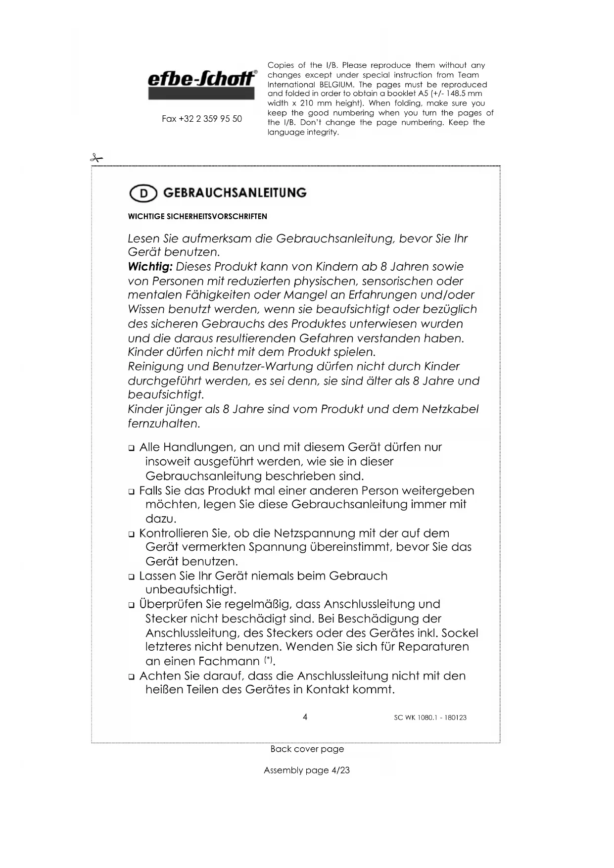 Fax +32 2 359 95 50 Benutzen Sie das Gerät nur zu Haushaltszwecken, wie in der Bedienungsanleitung angegeben. Tauchen Sie das Gerät niemals in Wasser oder andere Flüssigkeiten ein, weder zum Reinigen, noch zu einem anderen Zweck. Stellen Sie das Gerät niemals in die Spülmaschine. Benutzen Sie das Gerät nicht in der Nähe einer Wärmequelle. Benutzen Sie das Gerät nicht im Freien und bewahren Sie es an einem trockenen Platz auf. Benutzen Sie nur Zubehör, welches vom Lieferanten empfohlen wurde. Anderes Zubehör stellt eine Gefahr für den Benutzer dar und das Gerät könnte dadurch beschädigt werden. Ziehen Sie niemals an der Anschlussleitung, um das Gerät zu bewegen. Achten Sie darauf, dass die Anschlussleitung nicht irgendwo hängen bleibt und dies zum Fall des Gerätes führen könnte. Wickeln Sie die Anschlussleitung nicht um das Gerät herum und knicken Sie diese nicht. Stellen Sie das Gerät bzw. den Sockel auf eine stabile, ebene Fläche. Entfernen Sie den Stecker aus der Steckdose, bevor Sie das Gerät reinigen. Lassen Sie den Wasserkocher abkühlen, bevor Sie ihn erneut füllen, reinigen oder wegräumen. Entfernen Sie immer den Stecker aus der Steckdose, wenn Sie das Gerät nicht benutzen. Achten Sie darauf, dass die heißen Teile während des Betriebes nicht mit leicht entflammbarem Material, wie Gardinen, Tischdecken, usw. in Berührung kommen. Gerät nicht auf heiße Oberflächen oder in der Nähe von offenen Gasflammen abstellen – Gefahr der Gehäuseanschmelzung. Benutzen Sie nur kaltes oder lauwarmes (Trink-)Wasser. Benutzen Sie kein Wasser aus Badewannen, Waschbecken oder anderen Behältern. Copies of the I/B. Please reproduce them without any changes except under special instruction from Team International BELGIUM. The pages must be reproduced and folded in order to obtain a booklet A5 (+/- 148.5 mm width x 210 mm height). When folding, make sure you keep the good numbering when you turn the pages of the I/B. Don’t change the page numbering. Keep the language integrity. 6 SC WK 1080.1 - 180123