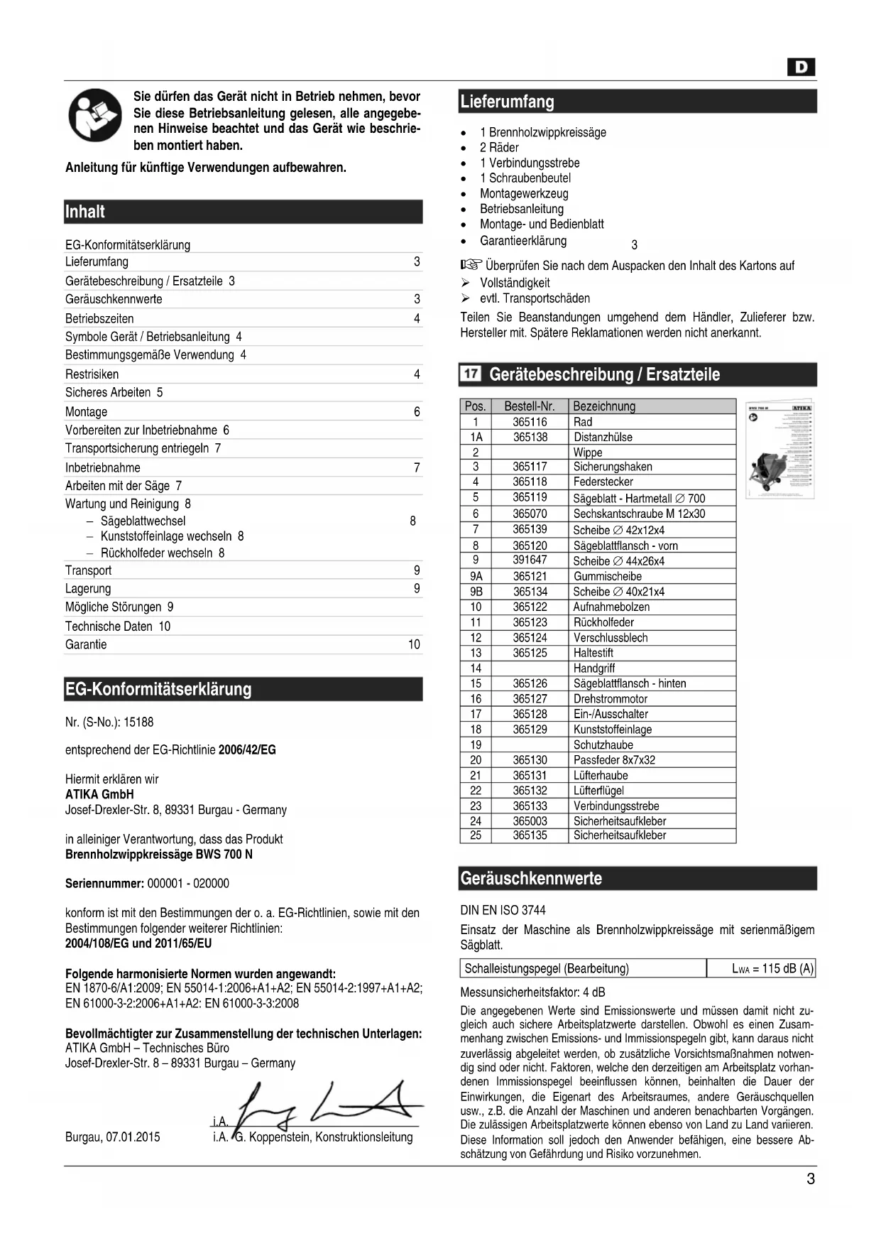 EG-Konformitätserklärung Nr. (S-No.): 15188 entsprechend der EG-Richtlinie 2006/42/EG Hiermit erklären wir ATIKA GmbH Josef-Drexler-Str. 8, 89331 Burgau - Germany in alleiniger Verantwortung, dass das Produkt Brennholzwippkreissäge BWS 700 N Seriennummer: 000001 - 020000 konform ist mit den Bestimmungen der o. a. EG-Richtlinien, sowie mit den Bestimmungen folgender weiterer Richtlinien: 2004/108/EG und 2011/65/EU Folgende harmonisierte Normen wurden angewandt: EN 1870-6/A1:2009; EN 55014-1:2006+A1+A2; EN 55014-2:1997+A1+A2; EN 61000-3-2:2006+A1+A2: EN 61000-3-3:2008 Bevollmächtigter zur Zusammenstellung der technischen Unterlagen: ATIKA GmbH – Technisches Büro Josef-Drexler-Str. 8 – 89331 Burgau – Germany