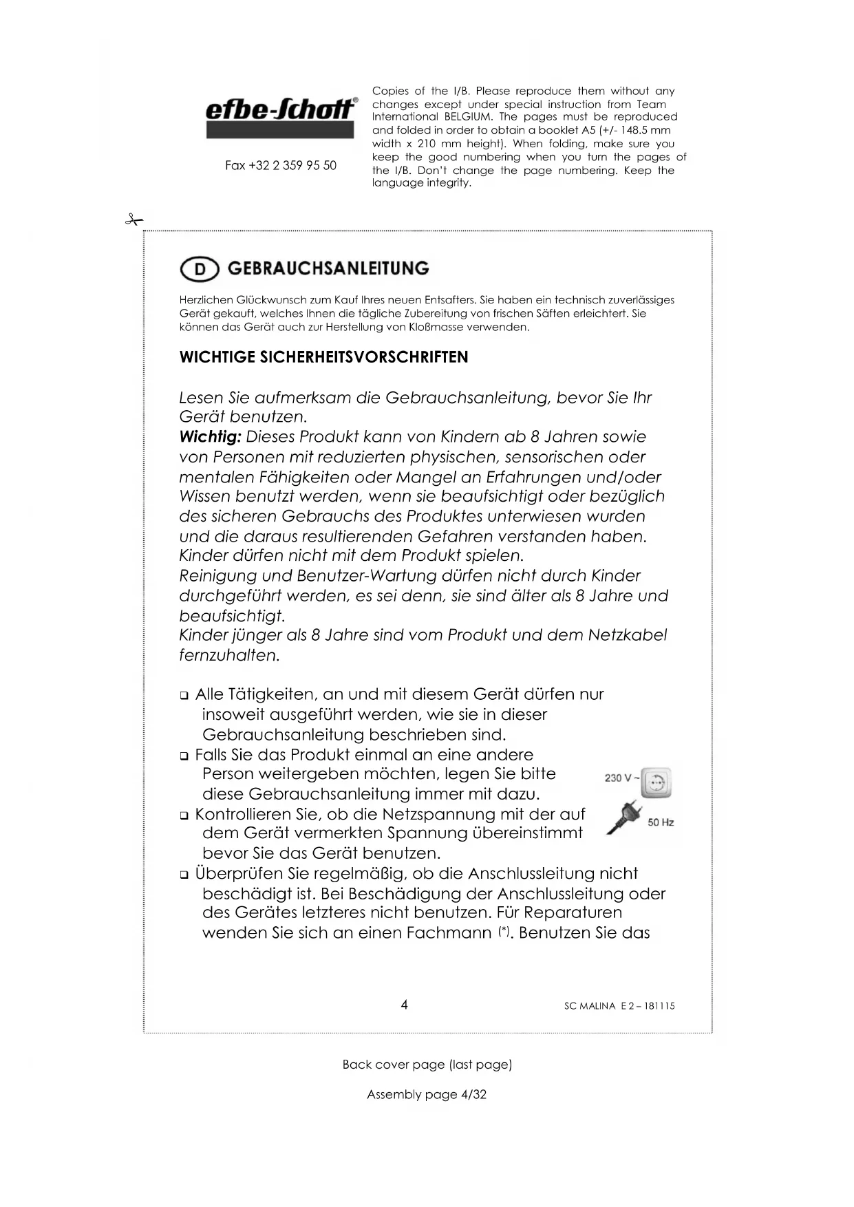 Fax +32 2 359 95 50 Gerät auf keinen Fall, wenn es sichtbare bzw. erkennbare Beschädigungen aufweist. Benutzen Sie das Gerät nur zu Haushaltszwecken, wie in der Bedienungsanleitung angegeben. Das Gerät nicht benutzen, wenn die Zentrifuge oder der Filterstreifen beschädigt ist. Benutzen Sie nur Zubehör, welches vom Lieferanten empfohlen oder verkauft wurde. Tauchen Sie das Gerät niemals in Wasser oder andere Flüssigkeiten, weder zum Reinigen, noch zu einem anderen Zweck. Geben Sie das Gerät niemals in die Spülmaschine. Benutzen Sie das Gerät nicht in der Nähe einer Wärmequelle. Stellen Sie das Gerät nicht auf heiße Flächen (z.B. Herdplatten) oder in die Nähe von offenen Flammen. Benutzen Sie das Gerät nicht im Freien und bewahren Sie es an einem trockenen Platz auf. Benutzen Sie nur Zubehör, welches vom Lieferanten empfohlen wurde. Anderes Zubehör stellt eine Gefahr für den Benutzer dar und das Gerät könnte dadurch beschädigt werden. Benutzen Sie das Gerät auf keinen Fall, wenn es sichtbare bzw. erkennbare Beschädigungen aufweist. Entfernen Sie den Stecker aus der Steckdose, bevor Sie das Gerät reinigen. Zum Reinigen wischen Sie die Betriebseinheit nur mit einem feuchten Lappen ab. Schalten Sie den Entsafter aus und ziehen Sie den Stecker aus der Steckdose, wenn Sie ihn nicht benutzen bzw. wenn Sie ihn zusammensetzen oder auseinander bauen. Vor dem Auswechseln von Zubehör, d.h. vor Öffnen des Spannbügels, muss das Gerät ausgeschaltet und der Stillstand abgewartet werden. Ziehen Sie niemals an der Anschlussleitung, um den Entsafter zu bewegen oder um ihn von der Steckdose zu trennen. Achten Sie darauf, dass die Anschlussleitung nicht irgendwo hängen bleibt und dies zum Fall des Gerätes führen könnte. Copies of the I/B. Please reproduce them without any changes except under special instruction from Team International BELGIUM. The pages must be reproduced and folded in order to obtain a booklet A5 (+/- 148.5 mm width x 210 mm height). When folding, make sure you keep the good numbering when you turn the pages of the I/B. Don’t change the page numbering. Keep the language integrity.