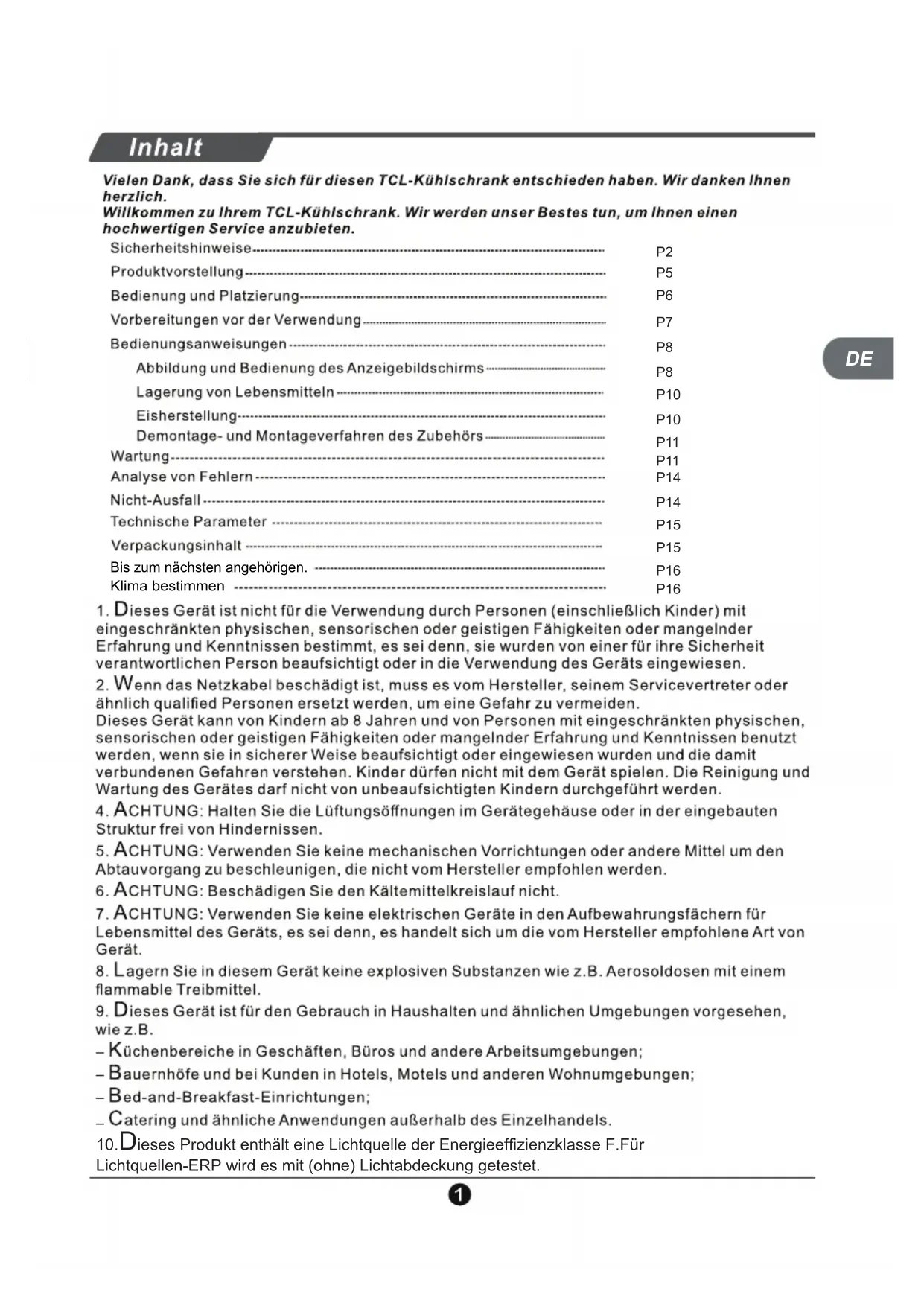 SN + 10 to + 32+ 16 to + 32+ 16 to + 38+ 16 to + 43TKlasse Erweitert gemäßigtGemäßigt Subtropisch Tropisch Tabelle 1 Klimaklassen Erweitertes gemäßigtes Klima: „Dieses Kühlgerät ist für Umgebungstemperaturen zwischen 10 ° C und 32 ° C vorgesehen.“ gemäßigt: „Dieses Kühlgerät ist für Umgebungstemperaturen zwischen 16 ° C und 32 ° C vorgesehen.“ Subtropisch: „Dieses Kühlgerät ist für Umgebungstemperaturen zwischen 16 ° C und 38 ° C vorgesehen.“ Tropisch: „Dieses Kühlgerät ist für Umgebungstemperaturen zwischen 16 ° C und 43 ° C vorgesehen.“ Klima bestimmenKlima bestimmen Sehr geehrter Kunde Sehr geehrter Kunde, wenn Sie Kundendienst benötigen, überprüfen Sie bitte die Garantiekarte für weitere Informationen. Verfügung: Alte Geräte haben noch einen gewissen Mehrwert. Ein umweltfreundlicher Ansatz gewährleistet das Recycling wertvoller Rohstoffe. Die in Ihrem Kühlschrank verwendeten Kältemittel und Isoliermaterialien erfordern spezielle Handhabungsverfahren. Stellen Sie vor der Handhabung sicher, dass sich auf der Rückseite des Kühlschranks keine Rohrschäden befinden. Aktuelle Informationen zu den Möglichkeiten der Entsorgung von Altkühlschränken und Verpackungen aus Altgeräten erhalten Sie beim örtlichen Gemeindeamt. Richtige Entsorgung dieses Produkts: Es weist darauf hin, dass dieses Produkt nicht mit anderen Haushaltsabfällen in der gesamten EU entsorgt werden darf. Um mögliche Schäden für die Umwelt oder die menschliche Gesundheit durch unkontrollierte Abfallentsorgung zu vermeiden, recyceln Sie diese verantwortungsbewusst, um die nachhaltige Wiederverwendung materieller Ressourcen zu fördern. Um Ihr gebrauchtes Gerät zurückzugeben, verwenden Sie bitte das Rückgabe- und Sammelsystem oder wenden Sie sich an den Händler, bei dem das Produkt gekauft wurde. Sie können dieses Produkt für ein umweltfreundliches Recycling verwenden. Bis zum nächsten angehörigen. 16■Lees de bedieningsinstructies zorgvuldig door voordat u het apparaat inschakelt en houd het goed bij. ■De producten kunnen zonder voorafgaande kennisgeving worden gewijzigd. TCL Home Appliances (Hefei) Co., Ltd. Adres: Nr. 10 Yunhu Road, economische ontwikkelingszone, Hefei Stad, Anhui provincie, China Tweede-deurs Huishoudelijke Koelkast