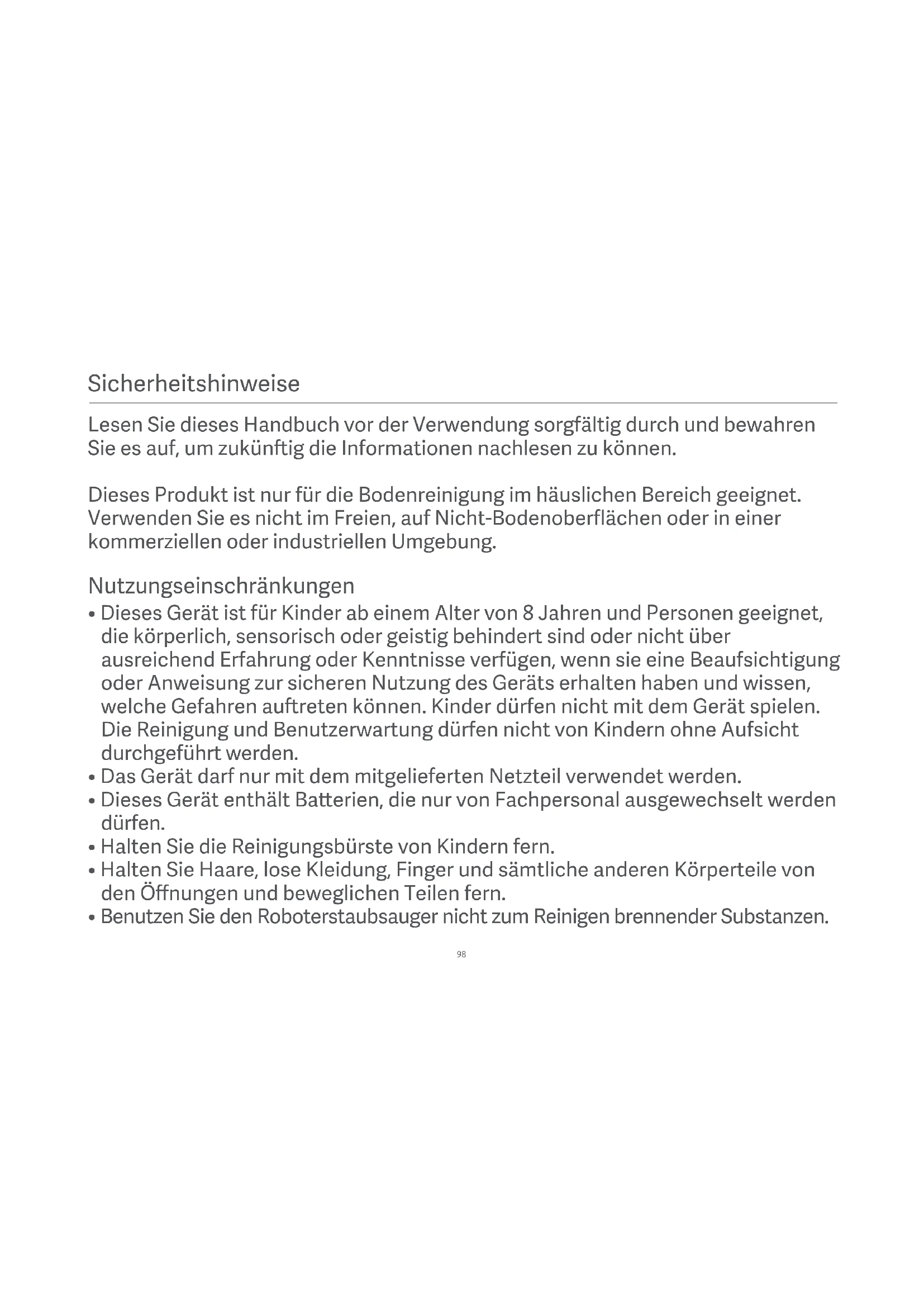 - Benutzen Sie den Roboterstaubsauger nicht zum Reinigen brennender Substanzen. Lesen Sie dieses Handbuch vor der Verwendung sorgfältig durch und bewahren Sie es auf, um zukünig die Informationen nachlesen zu können. Dieses Produkt ist nur für die Bodenreinigung im häuslichen Bereich geeignet. Verwenden Sie es nicht im Freien, auf Nicht-Bodenoberflächen oder in einer kommerziellen oder industriellen Umgebung.99