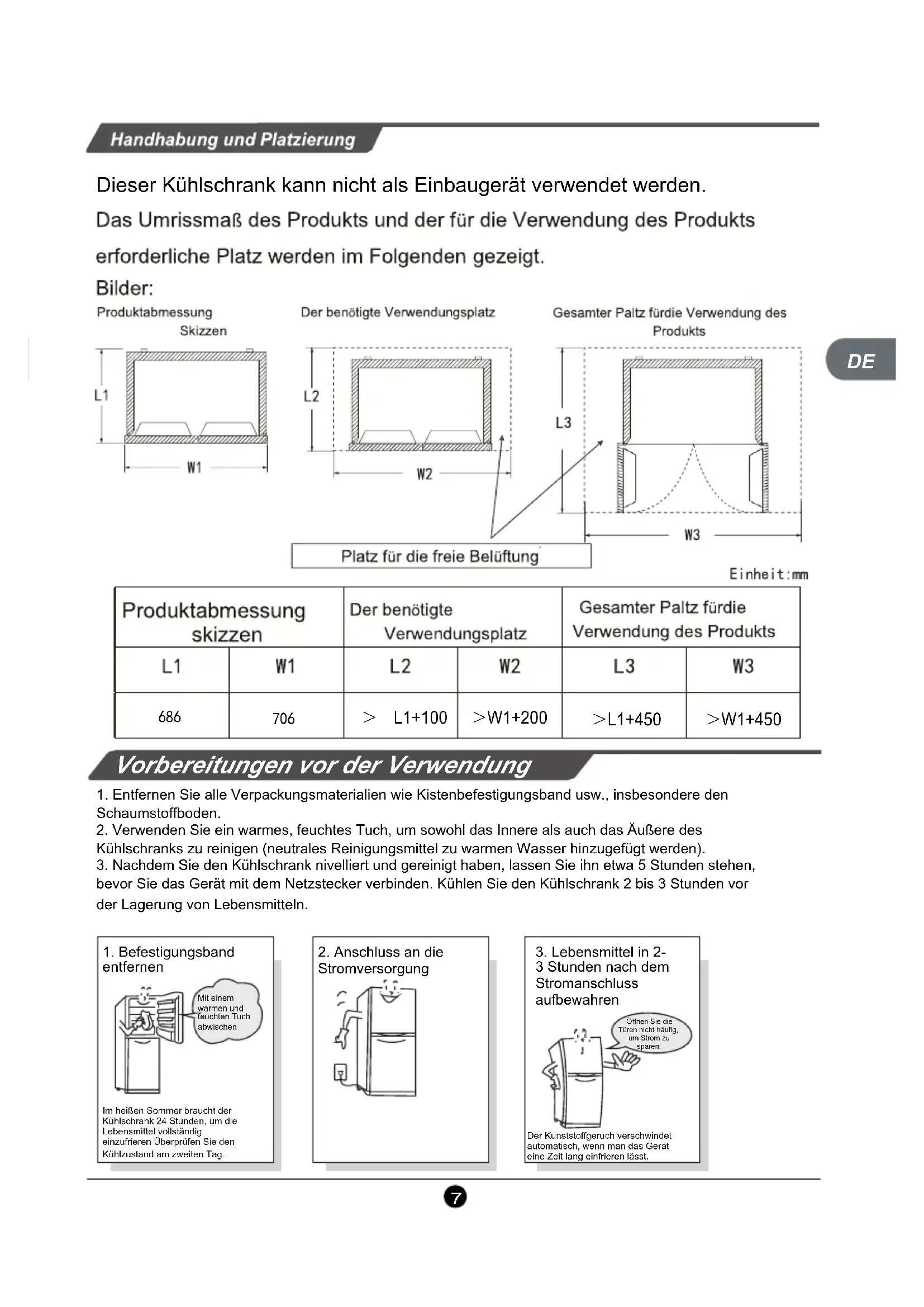 . Entfernen Sie alle Verpackungsmaterialien wie Kistenbefestigungsband usw., insbesondere den Schaumstoffboden.2. Verwenden Sie ein warmes, feuchtes Tuch, um sowohl das Innere als auch das Äußere des Kühlschranks zu reinigen (neutrales Reinigungsmittel zu warmen Wasser hinzugefügt werden).3. Nachdem Sie den Kühlschrank nivelliert und gereinigt haben, lassen Sie ihn etwa 5 Stunden stehen, bevor Sie das Gerät mit dem Netzstecker verbinden. Kühlen Sie den Kühlschrank 2 bis 3 Stunden vor der Lagerung von Lebensmitteln.1. Befestigungsband entfernen2. Anschluss an die Stromversorgung3. Lebensmittel in 2-3 Stunden nach dem Stromanschluss aufbewahrenMit einem warmen und feuchten Tuch abwischenIm heißen Sommer braucht der Kühlschrank 24 Stunden, um die Lebensmittel vollständig einzufrieren Überprüfen Sie den Kühlzustand am zweiten Tag.Öffnen Sie die Türen nicht häufig, um Strom zu sparen.Der Kunststoffgeruch verschwindet automatisch, wenn man das Gerät eine Zeit lang einfrieren lässt.DE