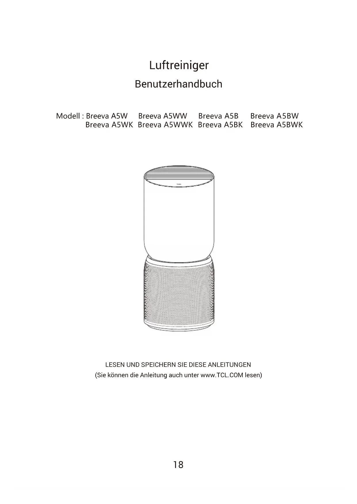 (Sie können die Anleitung auch unter www.TCL.COM lesen) Modell : Breeva A5W Breeva A5WW Breeva A5B Breeva A5BW Breeva A5WK Breeva A5WWK Breeva A5BK Breeva A5BWK19 produktbeschreibung packliste bezeichnung der einzelnen teile sicherheitsvorsichtsmaßnahmen erste schritte bedienfläche anweisungen app-verbindungsanweisungen wartung fehlerbehebung technische daten kundenbetreuung
