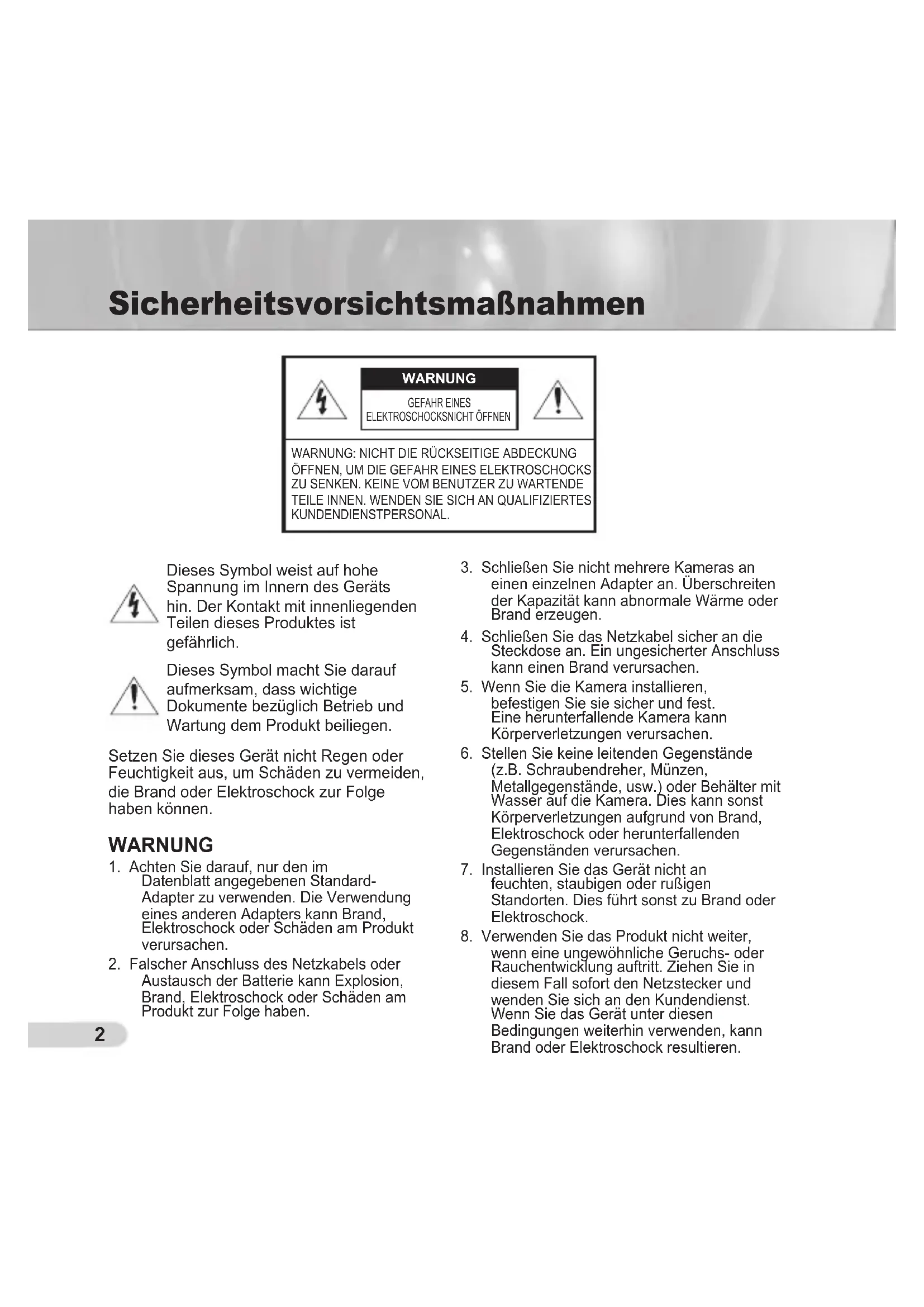 9. Wenn dieses Produkt nicht einwandfrei funktioniert, wenden Sie sich an den nächstgelegenen Kundendienst. Zerlegen oder modifizieren Sie dieses Produkt nie in irgendeiner Weise. (SAMSUNG haftet nicht für Schäden, die durch unbefugte Änderungen oder Reparaturversuche verursacht werden.)10. Spritzen Sie während der Reinigung kein Wasser direkt auf die Produktteile. Dies führt sonst zu Brand oder Elektroschock. VORSICHT 1. Lassen Sie keine Gegenstände auf das Produkt fallen oder setzen Sie es keinen starken Stößen aus. Halten Sie sich fern von Standorten die übermäßiger Erschütterung oder magnetischer Beeinflussung ausgesetzt sind. 2. Wenn Sie das bereits installierte Gerät versetzen möchten, achten Sie darauf, die Stromversorgung abzuschalten und es dann erst zu versetzen und erneut zu installieren. 3. Ziehen Sie den Netzstecker bei Gewitter. Nichtbeachtung kann Brand oder Schäden am Gerät verursachen.4. Halten Sie das Gerät fern von direktem Sonnenlicht und anderen Wärmestrahlungsquellen. Dies kann sonst zu Brand führen.5. Installieren Sie das Gerät an einem Ort mit guter Belüftung.6. Zielen Sie mit der Kamera nicht direkt in Richtung extrem heller Gegenstände wie zum Beispiel die Sonne, da dies den CCD-Bildsensor beschädigen kann. Das Gerät darf nicht mit Wasser oder anderen Flüssigkeiten in Berührung kommen. Außerdem dürfen keine mit Flüssigkeiten gefüllten Behälter, wie beispielsweise Vasen, darauf abgestellt werden.8. Der Netzstecker sollte jederzeit in Reichweite und zugänglich sein, da er aus der Steckdose entfernt werden muss, um das Gerät vollständig abzuschalten. FCC-Angaben Dieses Gerät entspricht Abschnitt 15 der FCC-Normen. Der Betrieb unterliegt folgenden zwei Bedingungen: