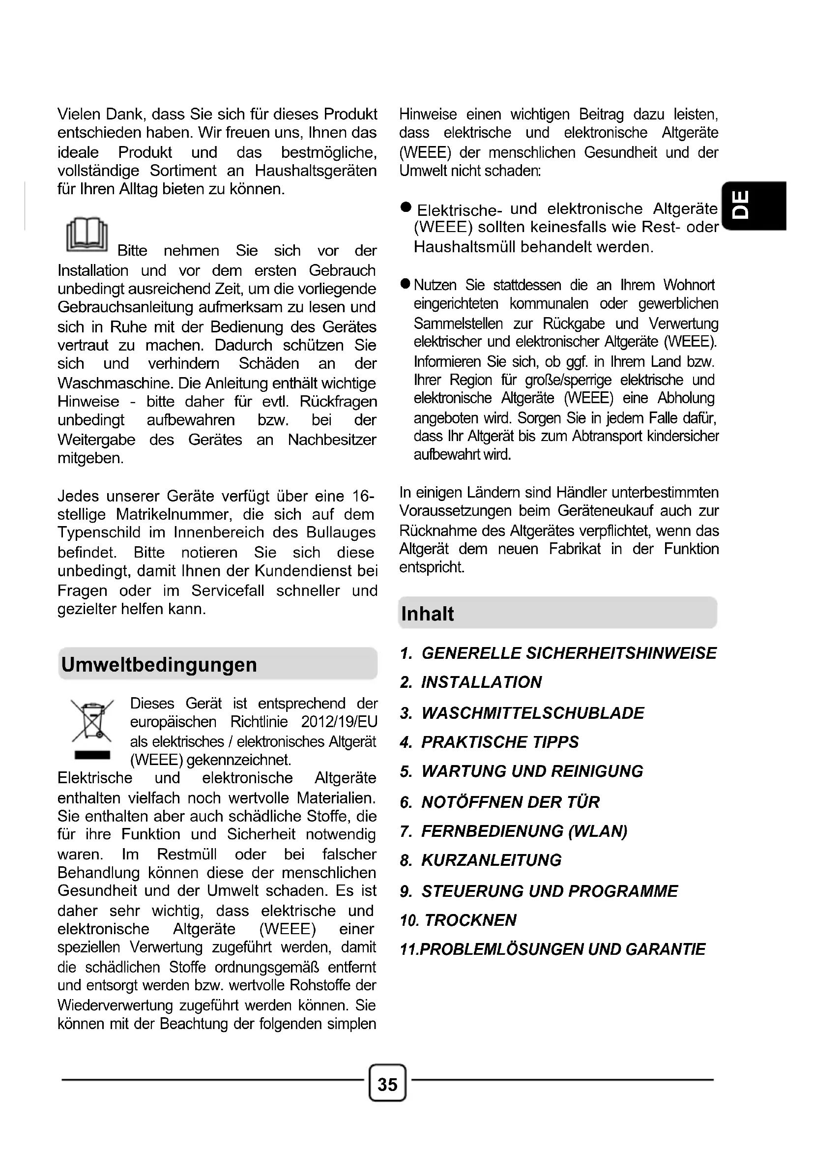 Bitte nehmen Sie sich vor der Installation und vor dem ersten Gebrauch unbedingt ausreichend Zeit, um die vorliegende Gebrauchsanleitung aufmerksam zu lesen und sich in Ruhe mit der Bedienung des Gerätes vertraut zu machen. Dadurch schützen Sie sich und verhindern Schäden an der Waschmaschine. Die Anleitung enthält wichtige Hinweise