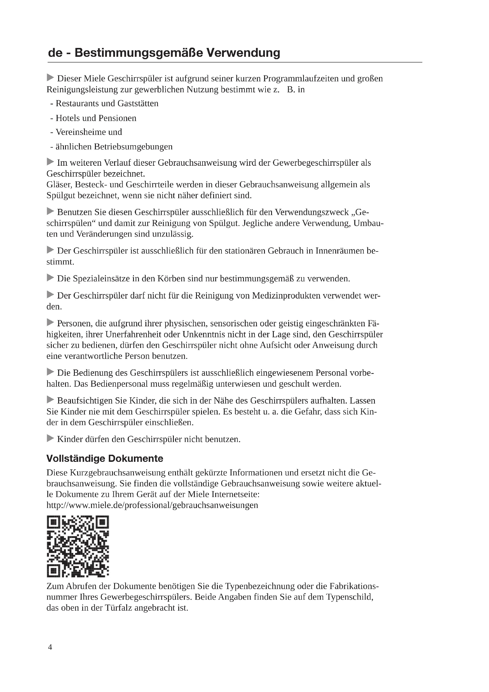Dieser Miele Geschirrspüler ist aufgrund seiner kurzen Programmlaufzeiten und großen Reinigungsleistung zur gewerblichen Nutzung bestimmt wie z.B. in - Restaurants und Gaststätten - Hotels und Pensionen - Vereinsheime und - ähnlichen Betriebsumgebungen Im weiteren Verlauf dieser Gebrauchsanweisung wird der Gewerbegeschirrspüler als Geschirrspüler bezeichnet. Gläser, Besteck- und Geschirrteile werden in dieser Gebrauchsanweisung allgemein als Spülgut bezeichnet, wenn sie nicht näher definiert sind. Benutzen Sie diesen Geschirrspüler ausschließlich für den Verwendungszweck „Ge- schirrspülen“ und damit zur Reinigung von Spülgut. Jegliche andere Verwendung, Umbau- ten und Veränderungen sind unzulässig. Der Geschirrspüler ist ausschließlich für den stationären Gebrauch in Innenräumen be- stimmt. Die Spezialeinsätze in den Körben sind nur bestimmungsgemäß zu verwenden. Der Geschirrspüler darf nicht für die Reinigung von Medizinprodukten verwendet wer- den. Personen, die aufgrund ihrer physischen, sensorischen oder geistig eingeschränkten Fä- higkeiten, ihrer Unerfahrenheit oder Unkenntnis nicht in der Lage sind, den Geschirrspüler sicher zu bedienen, dürfen den Geschirrspüler nicht ohne Aufsicht oder Anweisung durch eine verantwortliche Person benutzen. Die Bedienung des Geschirrspülers ist ausschließlich eingewiesenem Personal vorbe- halten. Das Bedienpersonal muss regelmäßig unterwiesen und geschult werden. Beaufsichtigen Sie Kinder, die sich in der Nähe des Geschirrspülers aufhalten. Lassen Sie Kinder nie mit dem Geschirrspüler spielen. Es besteht u. a. die Gefahr, dass sich Kin- der in dem Geschirrspüler einschließen. Kinder dürfen den Geschirrspüler nicht benutzen. Vollständige Dokumente Diese Kurzgebrauchsanweisung enthält gekürzte Informationen und ersetzt nicht die Ge- brauchsanweisung. Sie finden die vollständige Gebrauchsanweisung sowie weitere aktuel- le Dokumente zu Ihrem Gerät auf der Miele Internetseite: http://www.miele.de/professional/gebrauchsanweisungen Zum Abrufen der Dokumente benötigen Sie die Typenbezeichnung oder die Fabrikations- nummer Ihres Gewerbegeschirrspülers. Beide Angaben finden Sie auf dem Typenschild, das oben in der Türfalz angebracht ist.de - Gerätebeschreibung
