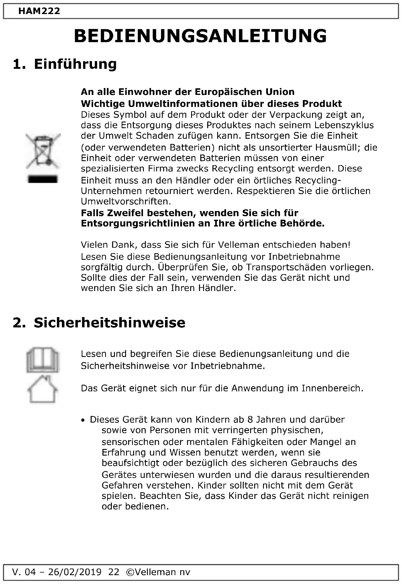 Finden Sie kostenlos die Bedienungsanleitung des Geräts HAM222 VELLEMAN als PDF.