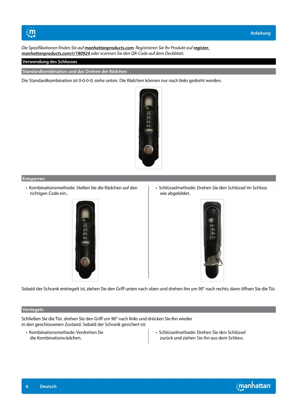Instructions EnglishDie Spezifikationen finden Sie auf manhattanproducts.com. Registrieren Sie Ihr Produkt auf register. manhattanproducts.com/r/180924 oder scannen Sie den QR-Code auf dem Deckblatt. Verwendung des Schlosses Standardkombination und das Drehen der Rädchen Die Standardkombination ist 0-0-0-0; siehe unten. Die Rädchen können nur nach links gedreht werden. Entsperren