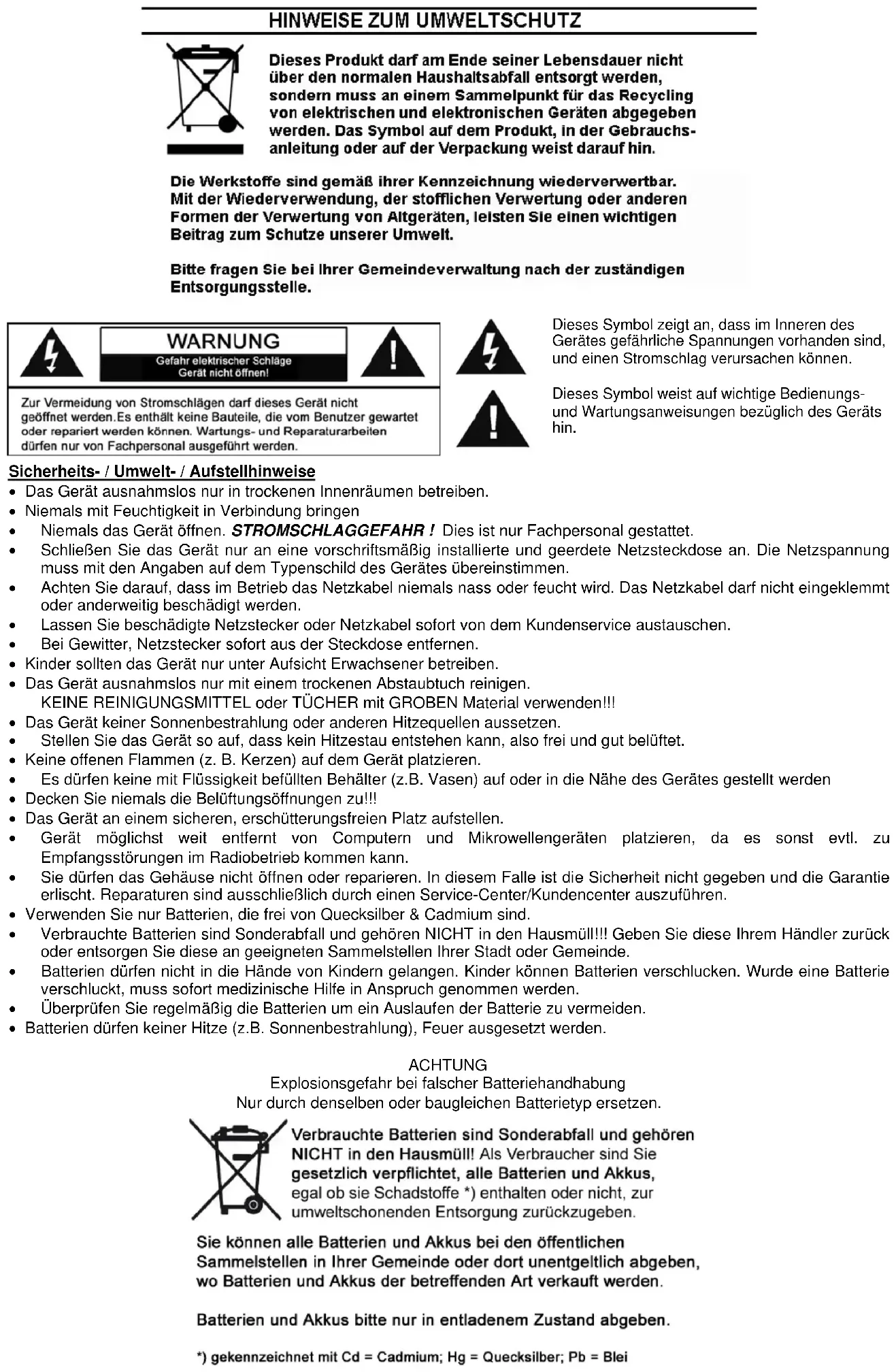 - Verbrauchte Batterien sind Sonderabfall und gehören NICHT in den Hausmüll!!! Geben Sie diese Ihrem Händler zurück oder entsorgen Sie diese an geeigneten Sammelstellen Ihrer Stadt oder Gemeinde.