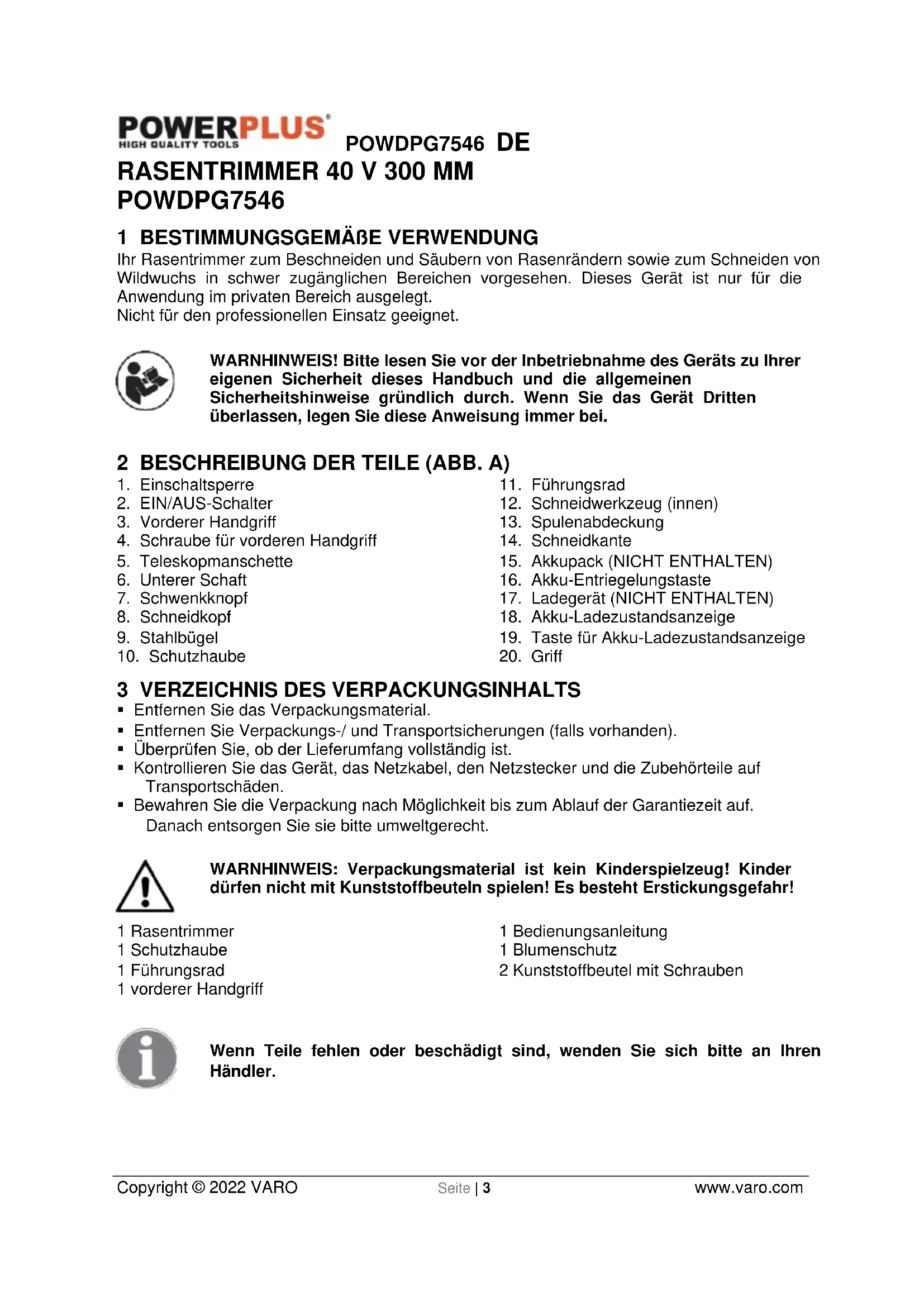 - Vor dem Absetzen das Gerät immer ausschalten und abwarten, bis das Schneidseil vollständig zum Stillstand gekommen ist. Nie versuchen, das laufende Schneidseil selbst zum Stillstand zu bringen.POWDPG7546 DE Copyright © 2022 VARO Seite | 7 www.varo.com WARNHINWEIS: Das Gerät kann nach dem Abschalten noch eine gewisse Zeit lang nachlaufen.