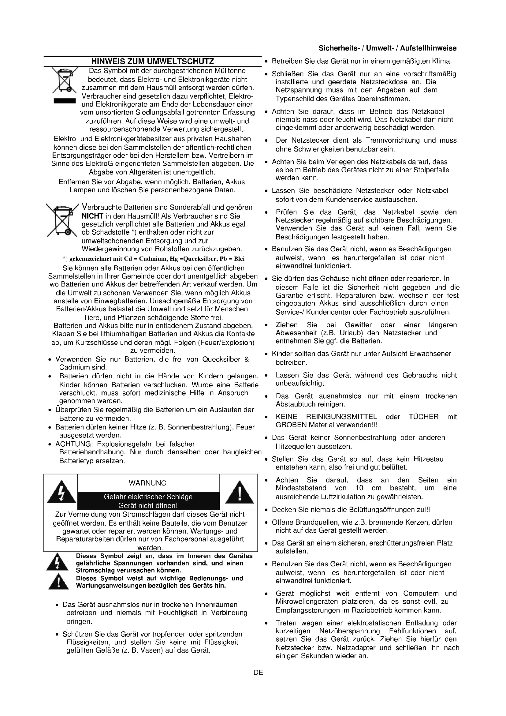 Verbrauchte Batterien sind Sonderabfall und gehören NICHT in den Hausmüll! Als Verbraucher sind Sie gesetzlich verpflichtet alle Batterien und Akkus egal ob Schadstoffe *) enthalten oder nicht zur umweltschonenden Entsorgung und zur Wiedergewinnung von Rohstoffen zurückzugeben. *) gekennzeichnet mit Cd = Cadmium, Hg =Quecksilber, Pb = Blei Sie können alle Batterien oder Akkus bei den öffentlichen Sammelstellen in Ihrer Gemeinde oder dort unentgeltlich abgeben wo Batterien und Akkus der betreffenden Art verkauf werden. Um die Umwelt zu schonen Verwenden Sie, wenn möglich Akkus anstelle von Einwegbatterien. Unsachgemäße Entsorgung von Batterien/Akkus belastet die Umwelt und setzt für Menschen, Tiere, und Pflanzen schädigende Stoffe frei. Batterien und Akkus bitte nur in entladenem Zustand abgeben. Kleben Sie bei lithiumhaltigen Batterien und Akkus die Kontakte ab, um Kurzschlüsse und deren mögl. Folgen (Feuer/Explosion) zu vermeiden.
