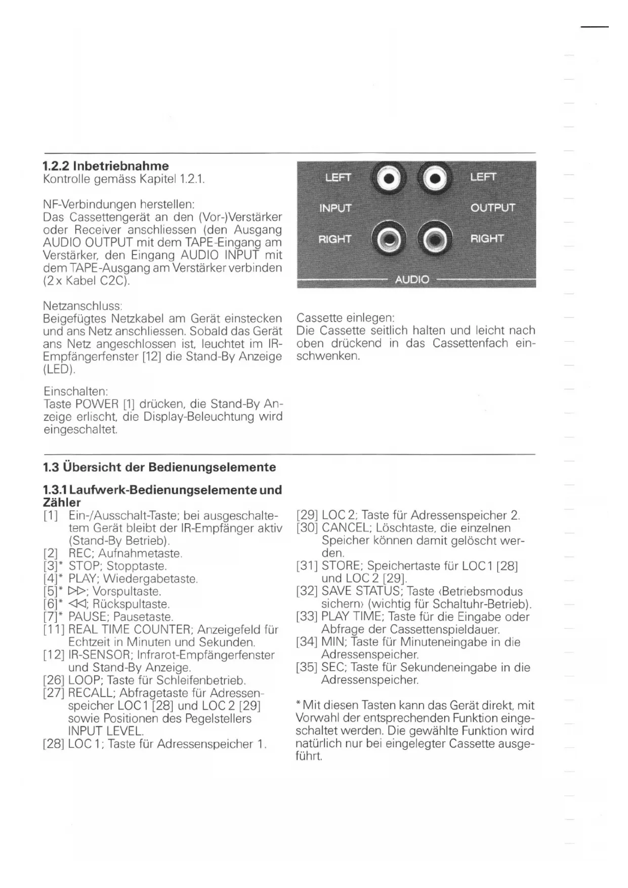 t30l tl3l tl4l tl5l tl6l lrlt l17l t18l tlel l2ol llr l22l t23l l24l l21l t35Il.2.2lnbetriebnahme Kontrolle gemäss Kapitel 1.2.1.N F-Verbi ndu ngen herstel len. Das Cassettengerät an den (Vor-)Verstärker oder Receiver anschliessen (den AusgangAUDIO OUTPUT mit dem TAPE-Eingang amVerstärker, den Eingang AUDIO INPUT mit dem TAPE-Ausga ng am Verstä rker verb i nden (2x Kabel C2C). Netzanschluss:Beigefügtes Netzkabel am Gerät einstecken und ans Netz anschliessen. Sobald das Gerät ans Netz angeschlossen ist, leuchtet im lR- EmpfängerJenster [12] die Stand-By Anzeige(LED)Einschalten:Taste POWER l1l drücken, die Stand-By An- zeige erlischt, die Display-Beleuchtung wird eingeschaltet.Cassette einlegen: Die Cassette seitlich halten und leicht nach oben drückend