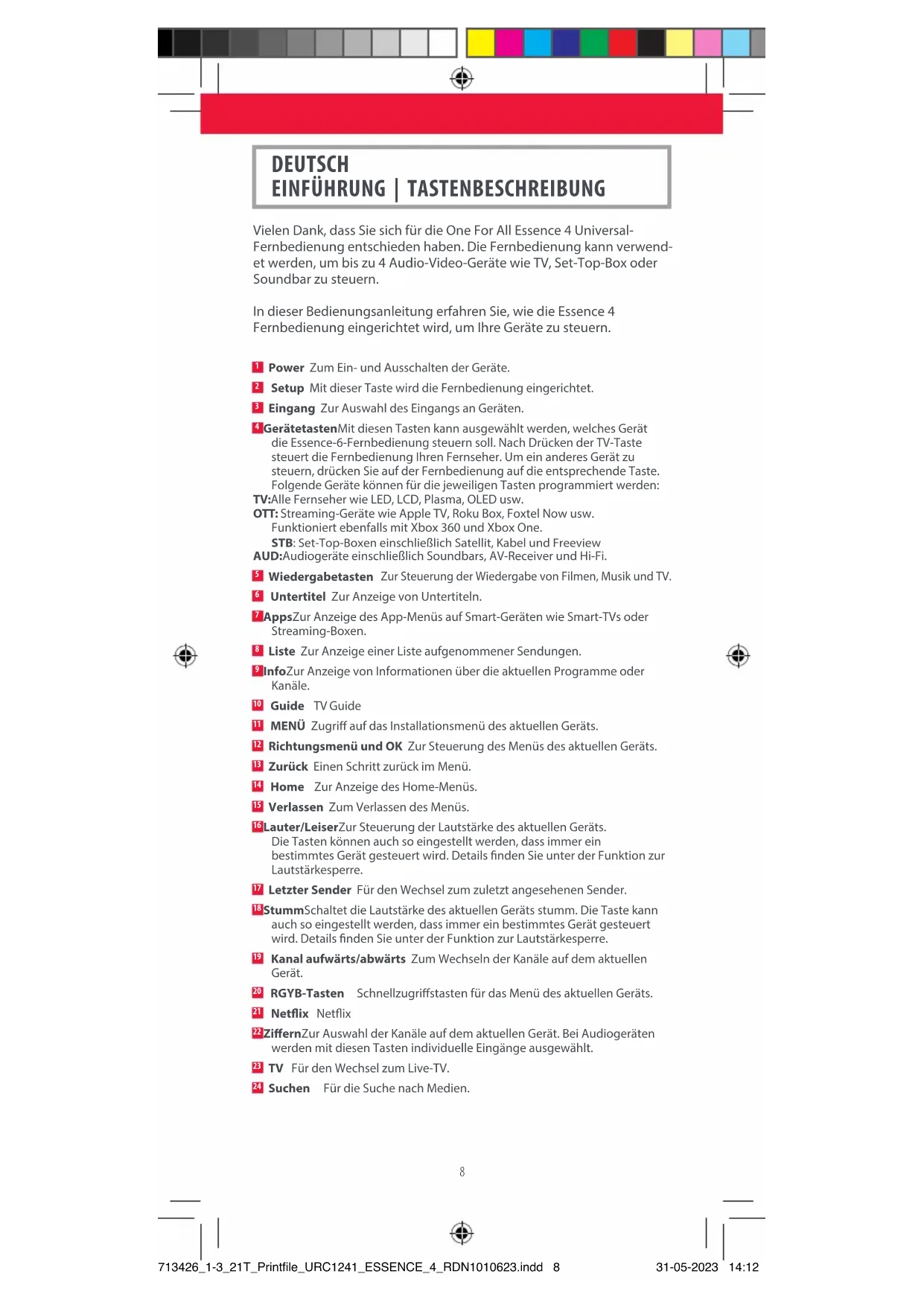 twice and the learned function has been deleted. facebook.com/ @oneforall.worldwide linkedin.com/ youtube.com/ oneforallworldwide company/one-for-all-worldwide/ user/oneforallproducts Connect with us 713426_1-3_21T_Printfile_URC1241_ESSENCE_4_RDN1010623.indd 7713426_1-3_21T_Printfile_URC1241_ESSENCE_4_RDN1010623.indd 7 31-05-2023 14:1231-05-2023 14:128 Vielen Dank, dass Sie sich für die One For All Essence 4 Universal- Fernbedienung entschieden haben. Die Fernbedienung kann verwend- et werden, um bis zu 4 Audio-Video-Geräte wie TV, Set-Top-Box oder Soundbar zu steuern. In dieser Bedienungsanleitung erfahren Sie, wie die Essence 4 Fernbedienung eingerichtet wird, um Ihre Geräte zu steuern. DEUTSCH