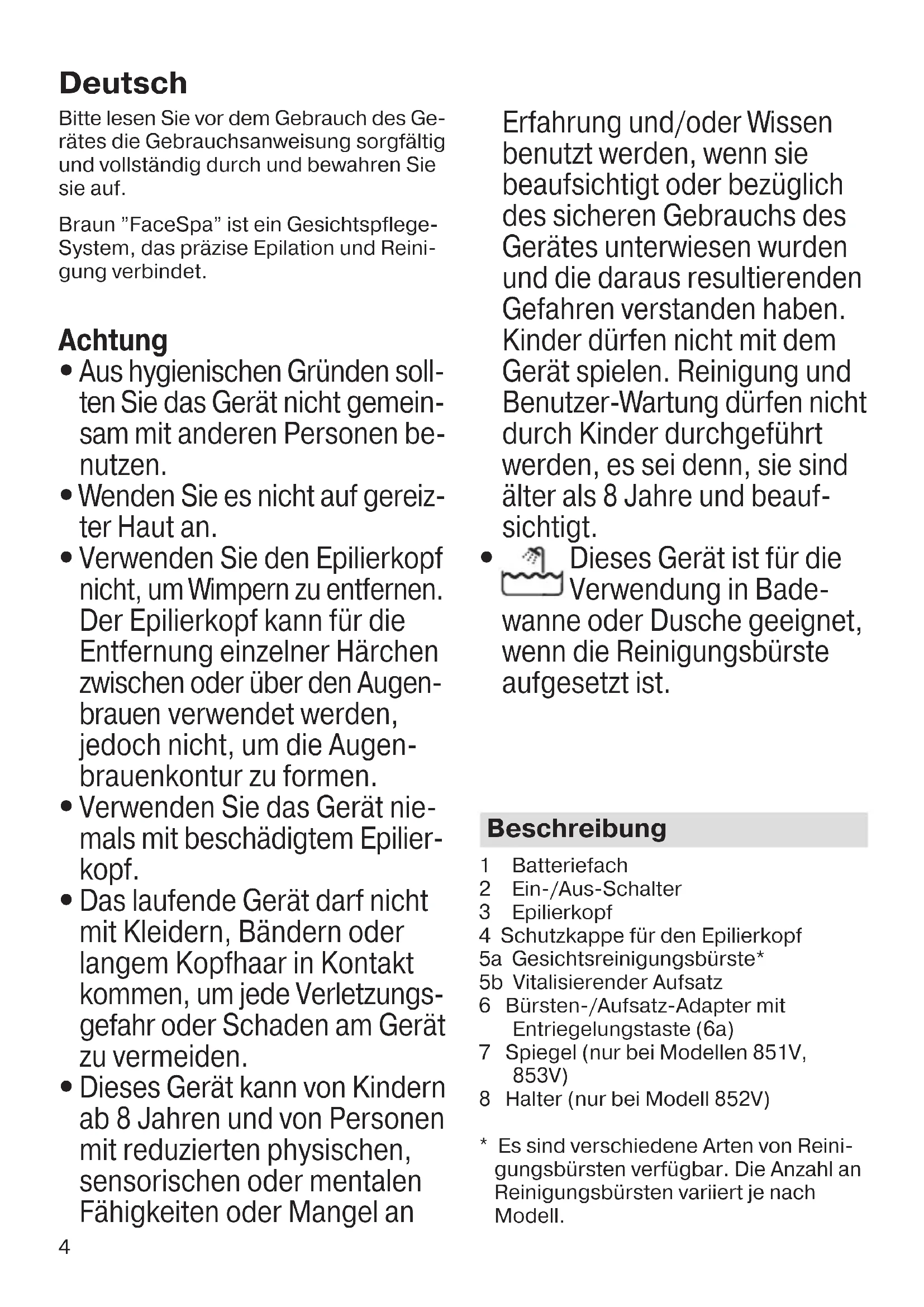Dieses Gerät ist für die Verwendung in Bade- wanne oder Dusche geeignet, wenn die Reinigungsbürste aufgesetzt ist. Beschreibung 1 Batteriefach 2 Ein-/Aus-Schalter 3 Epilierkopf 4 Schutzkappe für den Epilierkopf 5a Gesichtsreinigungsbürste* 5b Vitalisierender Aufsatz 6 Bürsten-/Aufsatz-Adapter mit Entriegelungstaste (6a) 7 Spiegel (nur bei Modellen 851V, 853V) 8 Halter (nur bei Modell 852V)