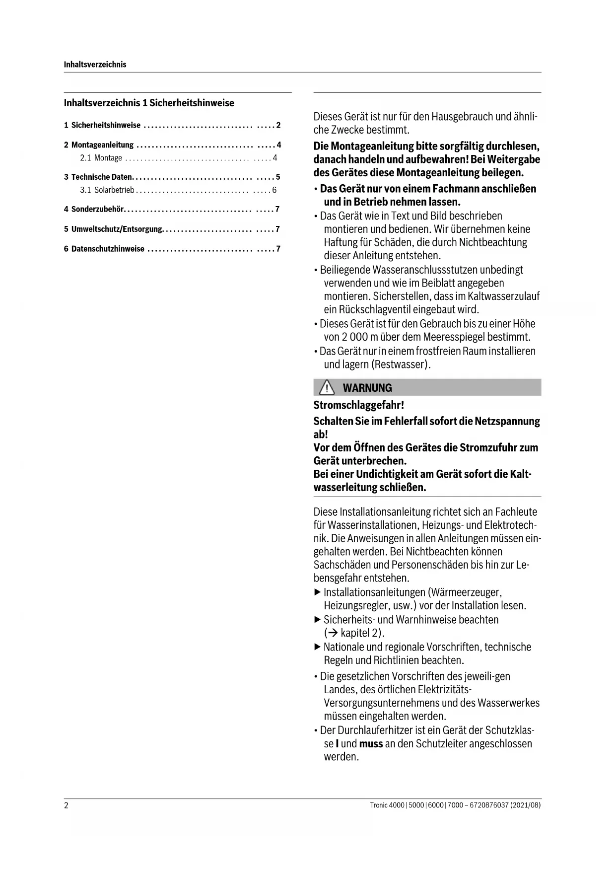 - Keinen Dampfreiniger benutzen. Sicherheit elektrischer Geräte für den Hausge- brauch und ähnliche Zwecke Zur Vermeidung von Gefährdungen durch elektrische Geräte gelten entsprechend EN 60335-2-35 folgende Vorgaben: „Dieses Gerät kann von Kindern ab 3 Jahren und darü- ber sowie von Personen mit verringerten physischen, sensorischen oder mentalen Fähigkeiten oder Mangel an Erfahrung und Wissen benutzt werden, wenn sie beaufsichtigt oder bezüglich des sicheren Gebrauchs des Gerätes unterwiesen wurden und die daraus resul- tierenden Gefahren verstehen. Kinder dürfen nicht mit dem Gerät spielen. Reinigung und Benutzer-Wartung dürfen nicht von Kindern ohne Beaufsichtigung durch- geführt werden.“ „Wenn die Netzanschlussleitung beschädigt wird, muss sie durch den Hersteller oder seinen Kunden- dienst oder eine ähnlich qualifizierte Person ersetzt werden, um Gefährdungen zu vermeiden.“Montageanleitung Tronic 4000 | 5000 | 6000 | 7000 – 6720876037 (2021/08)