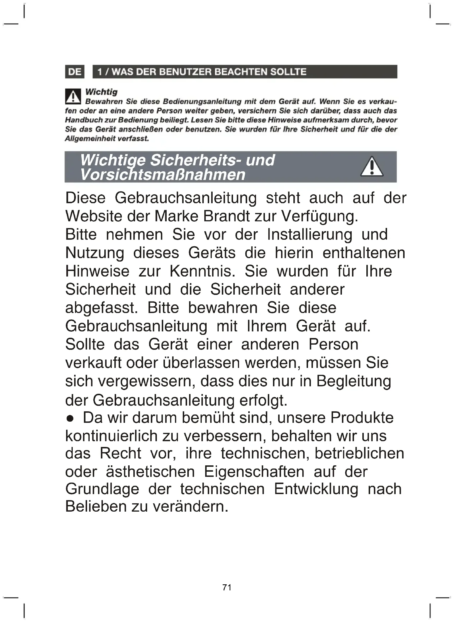 89Wichtige Sicherheits- und Vorsichtsmaßnahmen Diese Gebrauchsanleitung steht auch auf der Website der Marke Brandt zur Verfügung. Bitte nehmen Sie vor der Installierung und Nutzung dieses Geräts die hierin enthaltenen Hinweise zur Kenntnis. Sie wurden für Ihre Sicherheit und die Sicherheit anderer abgefasst. Bitte bewahren Sie diese Gebrauchsanleitung mit Ihrem Gerät auf. Sollte das Gerät einer anderen Person verkauft oder überlassen werden, müssen Sie sich vergewissern, dass dies nur in Begleitung der Gebrauchsanleitung erfolgt. ● Da wir darum bemüht sind, unsere Produkte kontinuierlich zu verbessern, behalten wir uns das Recht vor, ihre technischen, betrieblichen oder ästhetischen Eigenschaften auf der Grundlage der technischen Entwicklung nach Belieben zu verändern. 71● Damit Sie die Kenndaten Ihres Geräts in Zukunft problemlos wiederfinden, raten wir Ihnen, sie auf der Seite "Kundendienst" dieser Gebrauchsanleitung zu notieren. Wichtige Vorsichtsmaßnahmen Dieses Gerät wurde für die private Nutzung im Haushalt entwickelt. Verwenden Sie es deshalb nicht zu gewerblichen oder industriellen oder zu anderen als den bestimmungsgemäßen Zwecken.