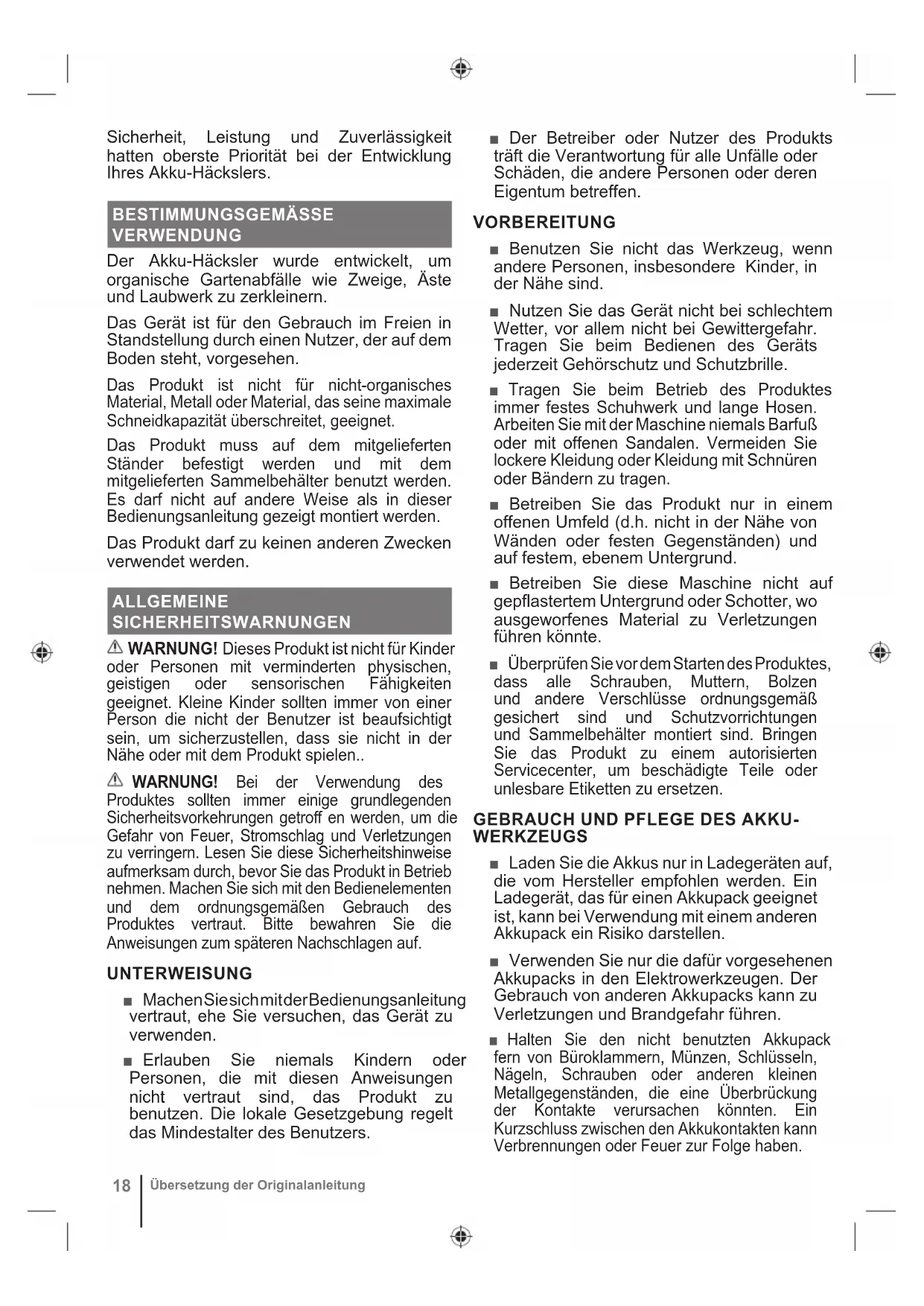 Traduction de la notice originaleSicherheit, Leistung und Zuverlässigkeit hatten oberste Priorität bei der Entwicklung Ihres Akku-Häckslers. BESTIMMUNGSGEMÄSSE VERWENDUNG Der Akku-Häcksler wurde entwickelt, um organische Gartenabfälle wie Zweige, Äste und Laubwerk zu zerkleinern. Das Gerät ist für den Gebrauch im Freien in Standstellung durch einen Nutzer, der auf dem Boden steht, vorgesehen. Das Produkt ist nicht für nicht-organisches Material, Metall oder Material, das seine maximale Schneidkapazität überschreitet, geeignet. Das Produkt muss auf dem mitgelieferten Ständer befestigt werden und mit dem mitgelieferten Sammelbehälter benutzt werden. Es darf nicht auf andere Weise als in dieser Bedienungsanleitung gezeigt montiert werden. Das Produkt darf zu keinen anderen Zwecken verwendet werden. ALLGEMEINE SICHERHEITSWARNUNGEN WARNUNG! Dieses Produkt ist nicht für Kinder oder Personen mit verminderten physischen, geistigen oder sensorischen Fähigkeiten geeignet. Kleine Kinder sollten immer von einer Person die nicht der Benutzer ist beaufsichtigt sein, um sicherzustellen, dass sie nicht in der Nähe oder mit dem Produkt spielen.. WARNUNG! Bei der Verwendung des Produktes sollten immer einige grundlegenden Sicherheitsvorkehrungen getroff en werden, um die Gefahr von Feuer, Stromschlag und Verletzungen zu verringern. Lesen Sie diese Sicherheitshinweise aufmerksam durch, bevor Sie das Produkt in Betrieb nehmen. Machen Sie sich mit den Bedienelementen und dem ordnungsgemäßen Gebrauch des Produktes vertraut. Bitte bewahren Sie die Anweisungen zum späteren Nachschlagen auf. UNTERWEISUNG ■ Machen Sie sich mit der Bedienungsanleitung vertraut, ehe Sie versuchen, das Gerät zu verwenden. ■ Erlauben Sie niemals Kindern oder Personen, die mit diesen Anweisungen nicht vertraut sind, das Produkt zu benutzen. Die lokale Gesetzgebung regelt das Mindestalter des Benutzers. ■ Der Betreiber oder Nutzer des Produkts träft die Verantwortung für alle Unfälle oder Schäden, die andere Personen oder deren Eigentum betreffen. VORBEREITUNG ■ Benutzen Sie nicht das Werkzeug, wenn andere Personen, insbesondere Kinder, in der Nähe sind. ■ Nutzen Sie das Gerät nicht bei schlechtem Wetter, vor allem nicht bei Gewittergefahr. Tragen Sie beim Bedienen des Geräts jederzeit Gehörschutz und Schutzbrille. ■ Tragen Sie beim Betrieb des Produktes immer festes Schuhwerk und lange Hosen. Arbeiten Sie mit der Maschine niemals Barfuß oder mit offenen Sandalen. Vermeiden Sie lockere Kleidung oder Kleidung mit Schnüren oder Bändern zu tragen. ■ Betreiben Sie das Produkt nur in einem offenen Umfeld (d.h. nicht in der Nähe von Wänden oder festen Gegenständen) und auf festem, ebenem Untergrund. ■ Betreiben Sie diese Maschine nicht auf gepflastertem Untergrund oder Schotter, wo ausgeworfenes Material zu Verletzungen führen könnte. ■ Überprüfen Sie vor dem Starten des Produktes, dass alle Schrauben, Muttern, Bolzen und andere Verschlüsse ordnungsgemäß gesichert sind und Schutzvorrichtungen und Sammelbehälter montiert sind. Bringen Sie das Produkt zu einem autorisierten Servicecenter, um beschädigte Teile oder unlesbare Etiketten zu ersetzen.